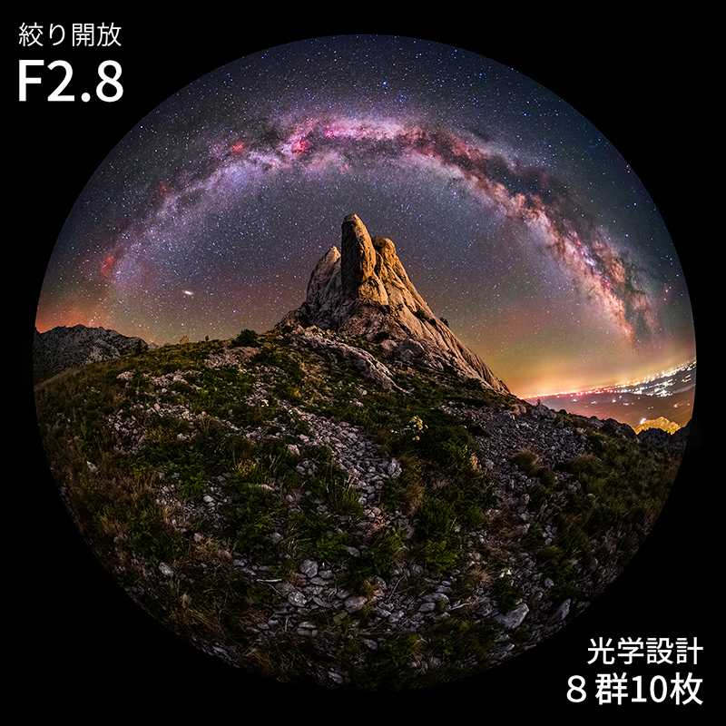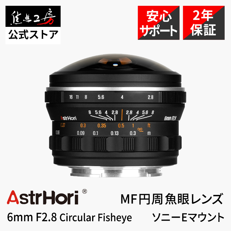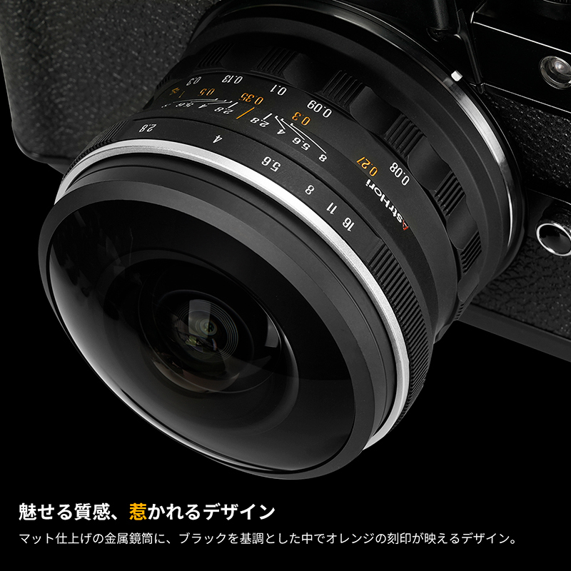 「AstrHori 6mm F2.8 CIRCULAR FISHEYE」は、フルサイズセンサー対応の円周魚眼レンズです。220°の圧倒的な視野角で世界を球体のように描写できます。F2.8の明るさと8群10枚の光学設計により、周辺までクリアで高コントラストな描写を実現し、夜景や星景でも鮮明な表現が可能です。フォーカスリングや絞りリングの直感的操作感と、マット仕上げ金属鏡筒でブラック×オレンジのデザインにより、撮影の快適さと所有欲を両立。約340gの軽量コンパクトボディは持ち運びやすく、アウトドアや旅行にも最適です。最短撮影距離0.08mで被写体に近づいた独創的な構図も可能で、風景を水滴やガラス玉のように収めたような箱庭的表現など、様々な撮影を楽しめる1本です。360°パノラマやVR素材も少ない枚数で撮影可能です。 220°の視野角と円周魚眼ならではの描写