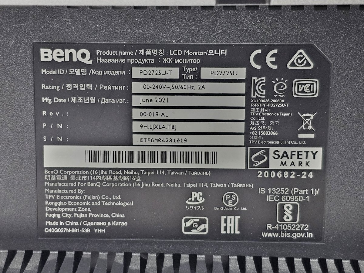 | 商品説明 | ※スマートフォンの方は「商品説明を読む」を タップすると追加画像が表示されます。 メーカー: BenQ 型番: PD2725U 製造年度: June, 2021 付属品:写真に写っている物で全てです。 【仕様・特長】 色制度にこだわるAQCOLORシリーズ、PD2725U-JP AQCOLORシリーズは、出荷時のカラーキャリブレーションを実施し、正確な色を表示することができるプロフェッショナルモニターです。 各種色域を広範囲にカバー sRGBとRec. 709は100%、Display P3のカバー率95%のIPSパネルを採用。 カラーシフトを最小限に抑え、絶対的なデザインの完成度を高めます。 出荷時にすべての製品でカラーキャリブレーション済、テレワークにもおすすめな4辺フレームレススマートデザイン PD2725U-JPは出荷時にすべてのモニターでカラーキャリブレーションを行っているので、マルチモニター環境でもモニター間の色の差異がなく、ストレスなく作業が可能です。 スリムでフレームレスな筐体はマルチモニター環境におすすめ、オフィスやテレワークで活躍します。 Thunderbolt 3対応で快適な作業環境を構築 PD2725U-JPは2系統のThunderbolt3に対応、65Wまで電力供給できると同時に、最大2台の4K 60P動画を同時再生できる高速なデータ転送が可能。 ノートPCをモニターから充電しつつ作業することができます。 ●本体重量:約8.3kg ●電源:内蔵 ●画面サイズ:27インチワイド ●アスペクト比:16:9 ●パネル駆動方式/バックライト:IPS/LED ●最大解像度(英略称/ピクセル数):3840×2160 ●輝度(cd/2 or ANSI):250cd/m2(HDR時400cd/m2) ●コントラスト比:1200:1 ●視野角(左右/上下):178°/178° ●応答速度:5ms GTG ●VESA規格:あり(100×100mm) ●消費電力:最大185W/標準44W/エコーなし ●入力端子:HDMI 2.0×2/Display Port 1.4/Thunderbolt 3×2(65W給電、15W給電) ●USB:USB3.1×3(Downstream×2、Upstream×1) ●スピーカー:2.5W×2 ●Kensington(ケンジントンロック):対応 管理用: H |