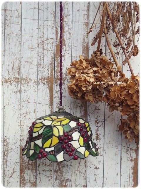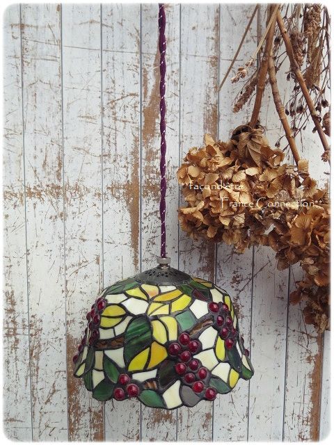 ・.* 黄色いお花と葡萄のステンドグラスシェードのモダンなペンダントライト *.・