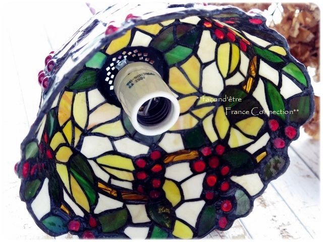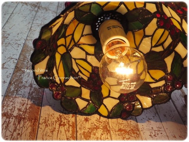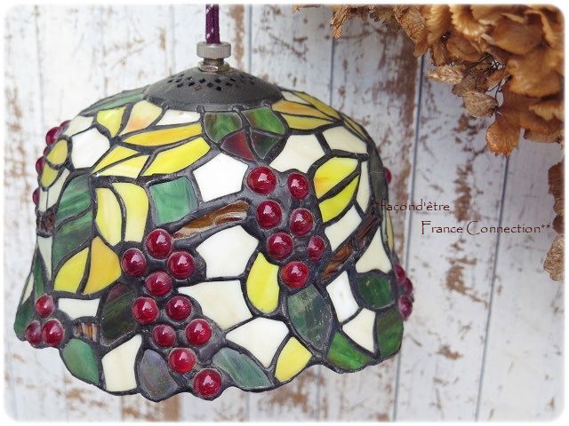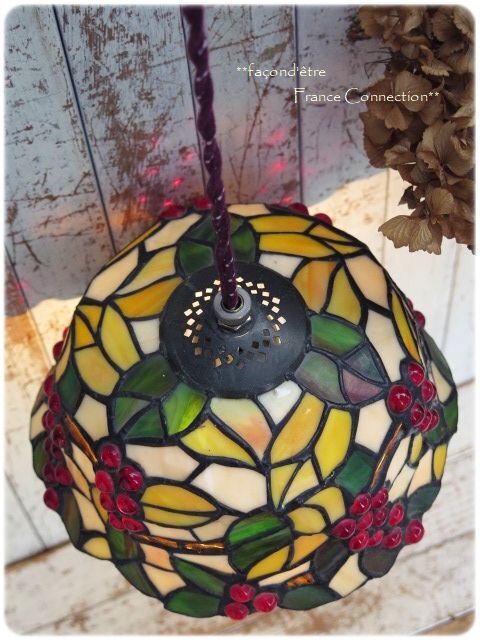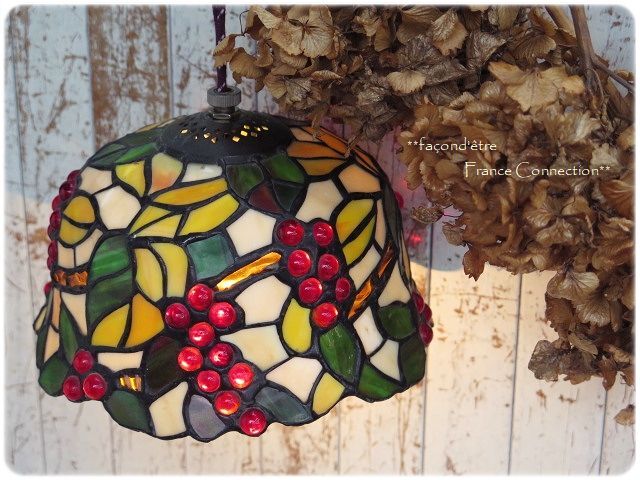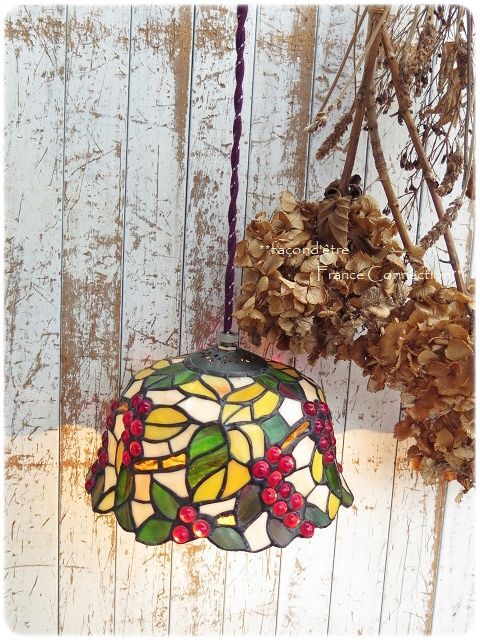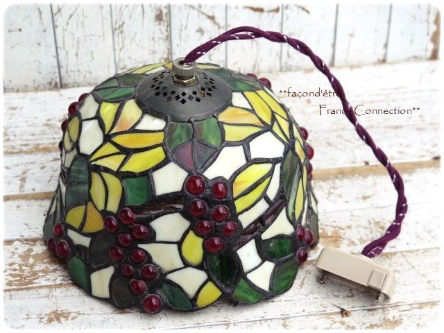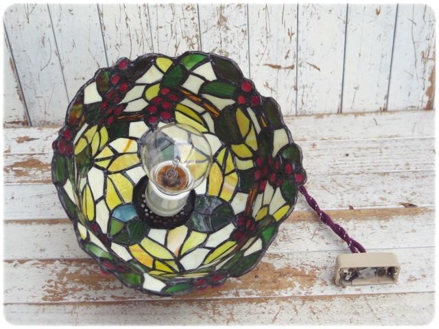 暖かみのあるマーブルガラスのステンドグラスやワイン色のガラス玉の葡萄の装飾が美しい照明です*