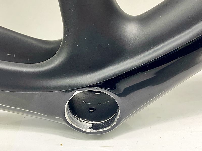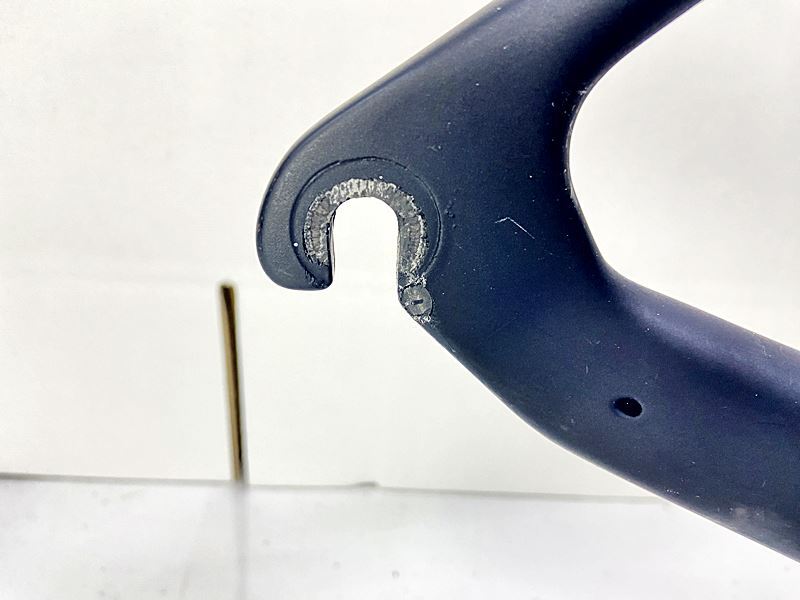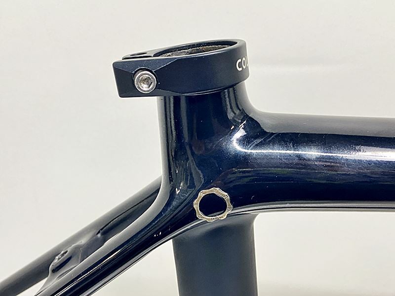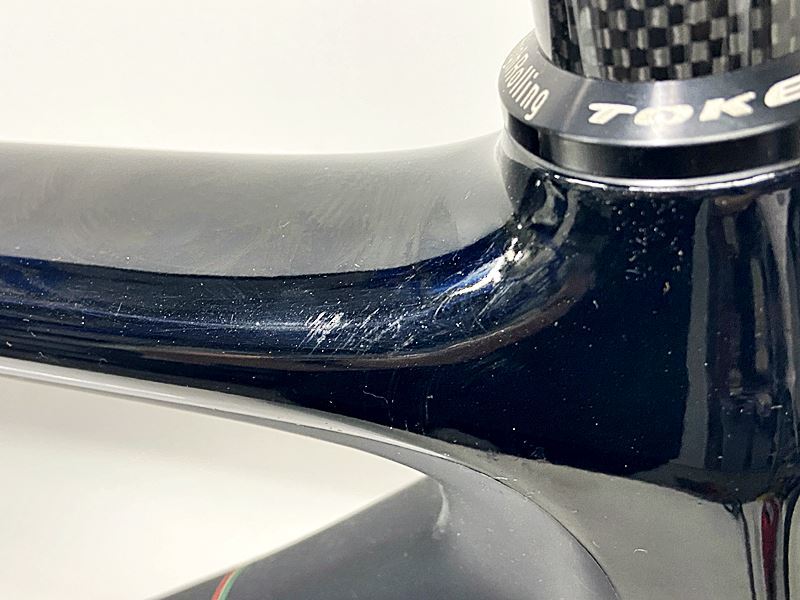 トップチューブ上面に微細な打痕、リアエンドに塗装ハゲがあり、チェーンステー内側にチェーン落ちによるキズ、スレが見られます。