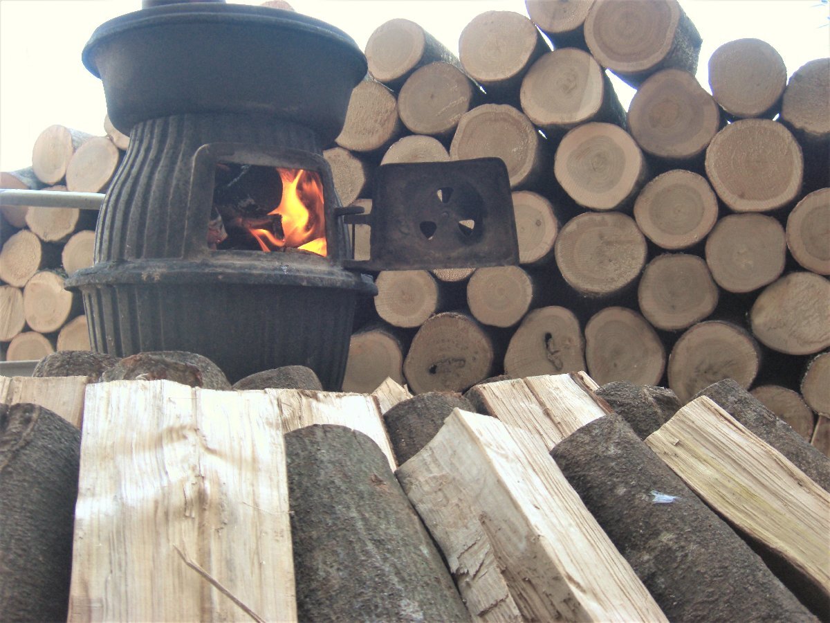 | 焚き口からも、又ストーブ内部でも『薪』が仕える事無く、丸鋸でカットした『ころころ薪』です。 |