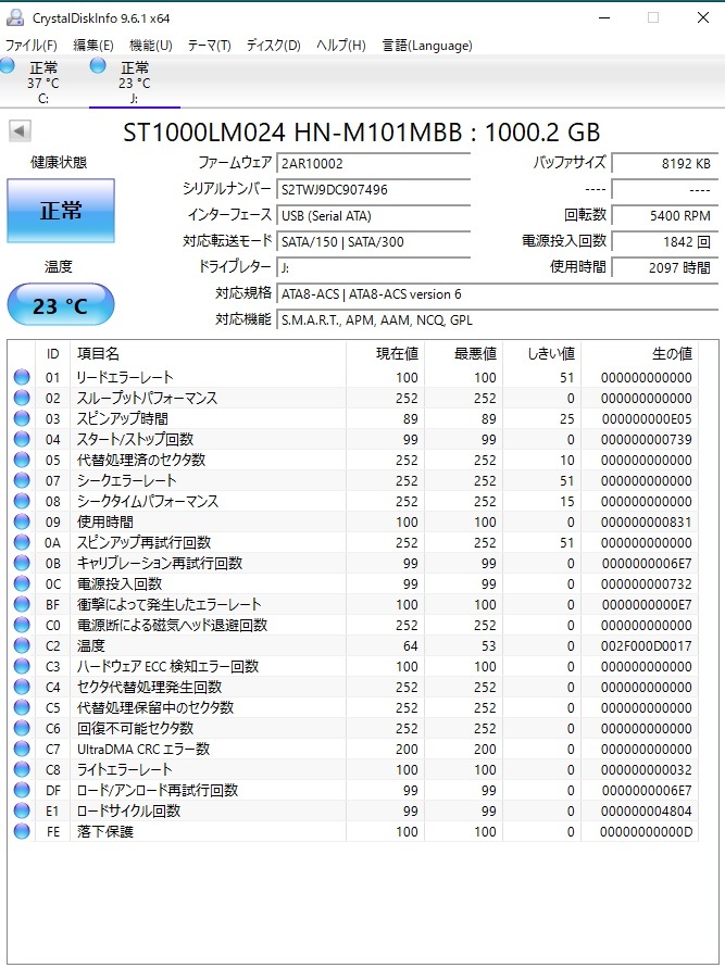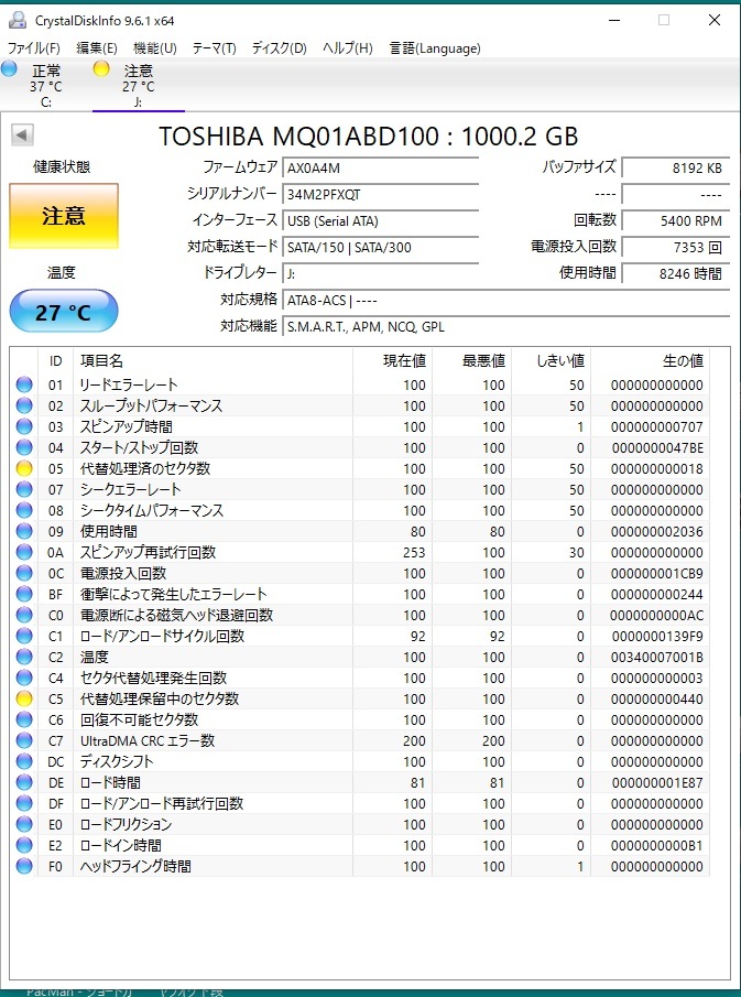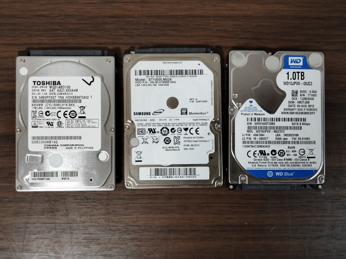 2.5インチ/SATA HDD・3個まとめて   1TB×3個(正常判定×2・注意判定×1)