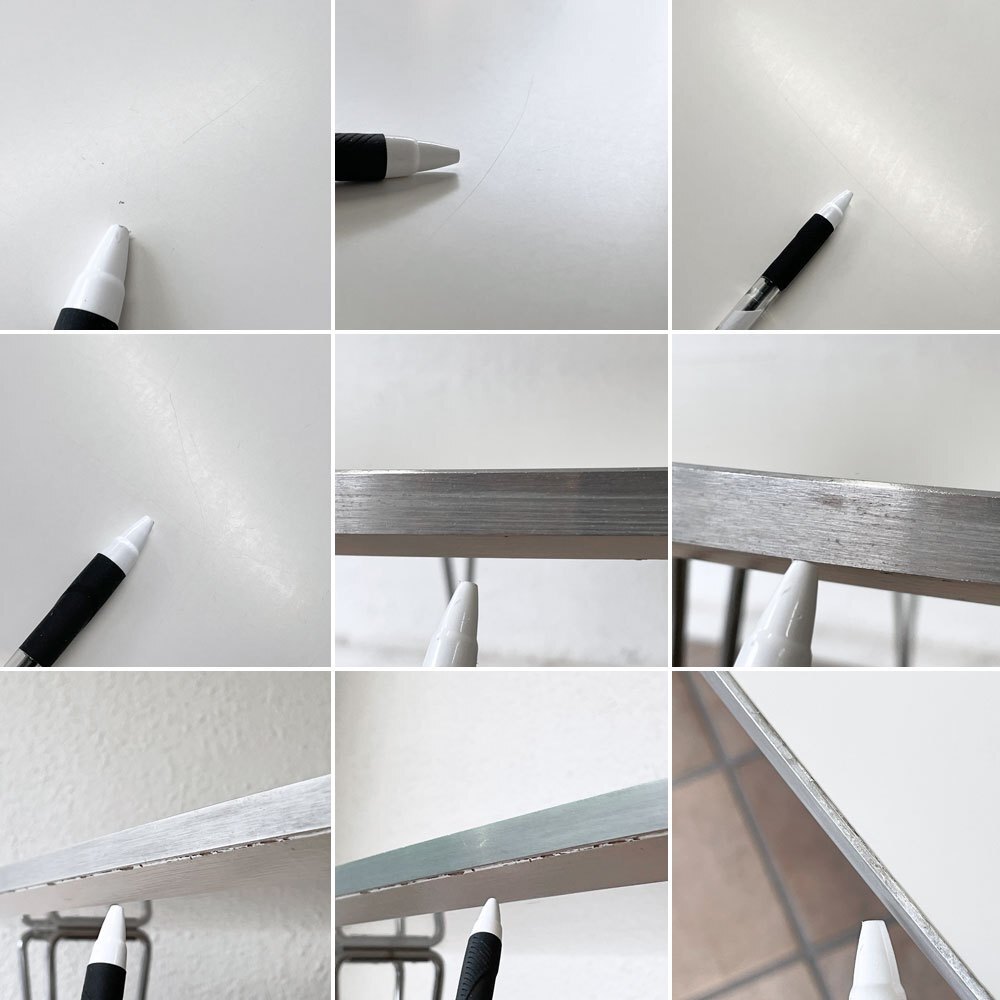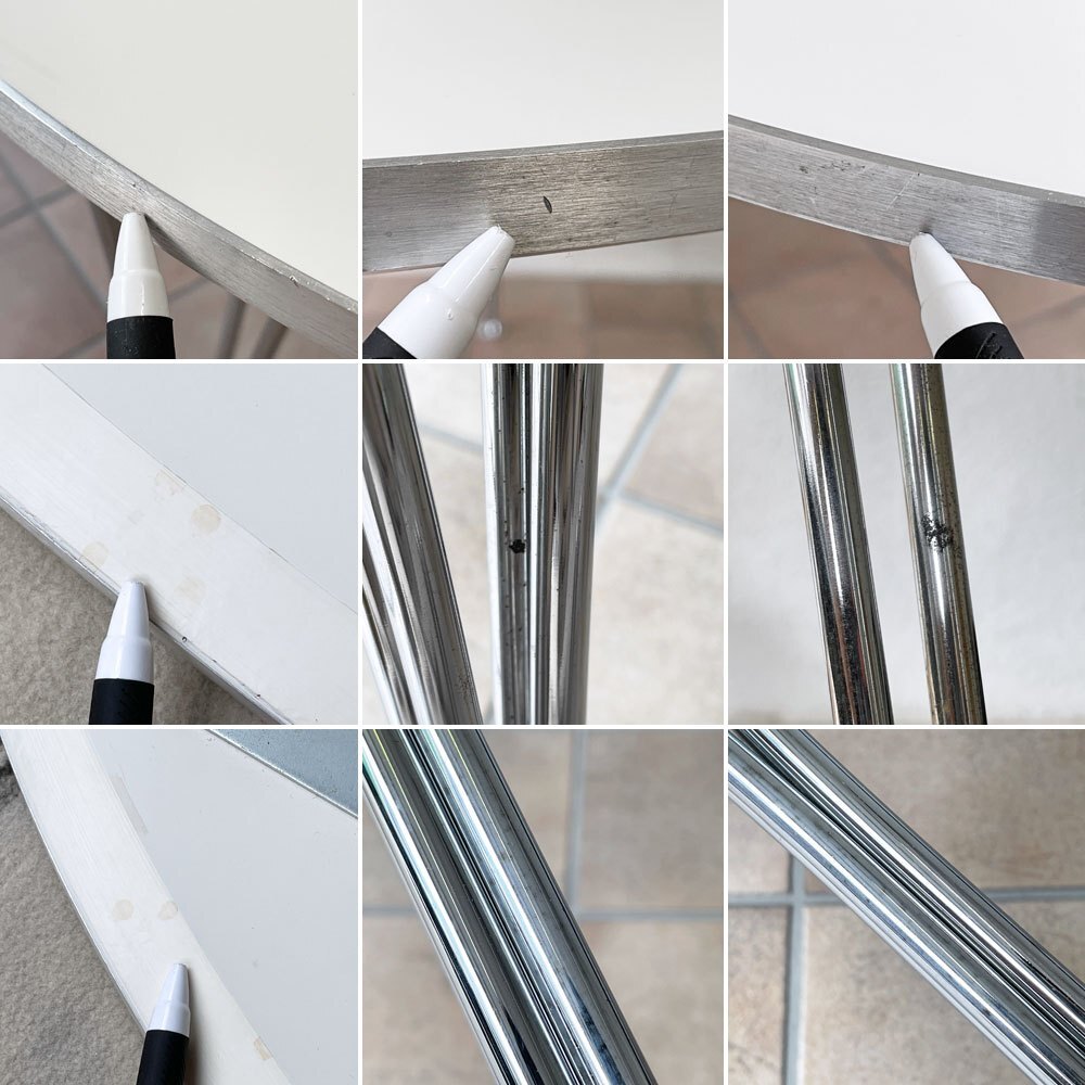 | コンディション | 使用に伴う擦れ傷の他、天板にはスクラッチやうっすらとした線傷、縁の黒ずみや軽微な打痕、長辺側を中心とした裏面のペイントロス、小染み、脚部フレームには取りきれない錆くすみ等はございますがいずれも大きく目立つものではございません。グラつき等ご使用に問題となるダメージは無く、今後とも雰囲気を楽しみながらお使い頂けるUSED品として概ね良好なコンディションを保っております。 ※こちらは テーブル単品での販売です。 ※特筆すべきコンディションは出来るだけ記載させて頂きますが、細かい擦れや傷、汚れ等を完全にお伝えする事は出来ません。画像をご確認の上、ご入札をご検討下さいませ。 ※取扱説明書や保証書等は記載が無い限り付属いたしません。 |
