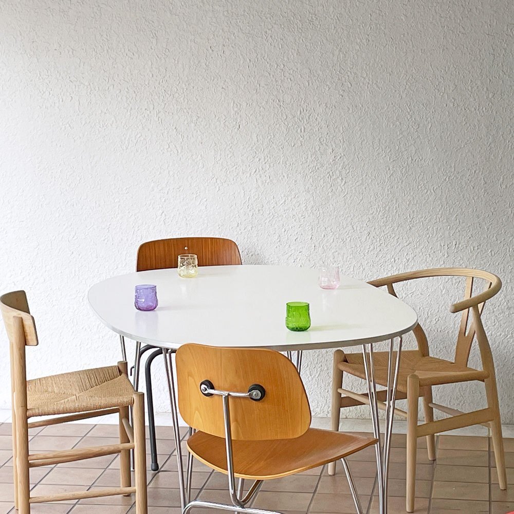| コメント | 1872年に創業したデンマークの家具ブランド、"フリッツ・ハンセン / Fritz Hansen"。 「たった1つの家具が部屋や建物全体を美しくすることができ、その空間で過ごす人々の幸せを高める」という信念のもと、長年に渡り一流デザイナーと共に数多くの名作を生み出しています。 こちらは、セブンチェアでもお馴染み巨匠アルネ・ヤコブセン、天童木工にも家具デザインを提供したブルーノ・マットソン、そして数学者であり建築家のピート・ハインの3名の共作により1968年にデザインされた「スーパー楕円テーブル」シリーズのBテーブル"B612"となります。 数学者であるPiet Hein(ピート・ハイン)が作り出した長方形と楕円を重ねて、その中間点を結んで描いた「完璧なラインの楕円」から成る天板デザイン。 座る面があるわけではないのに、なぜか椅子がそこに向くといった感覚が生まれます。 それでいてどの角度でも設置することができ、テーブルに末席を作らないことで高く評価され、「民主主義のテーブル」の愛称で世界中で愛されています。 Bテーブルは、“ブルーノ・マットソン / Bruno Mathsson”が手掛けた「スパンレッグ」と呼ばれる脚部のデザインを組み合わせたもの。 「スパンレッグ」と呼ばれるこの脚は、天板に取り付けられたベースプレートに挟み込むようにして取り付ける事が出来、工具を必要としない画期的なデザインのものとなります。 天板は傷に強く撥水性のあるラミネートトップとなっており、クリーンな外見を保てる仕様。 アルネ・ヤコブセンの手掛けたアントチェアやセブンチェアの様な北欧デザインは勿論、イームズのシェルチェアに代表されるようなミッドセンチュリーデザインとも相性が良く、様々な組み合わせを楽しむ事が出来る万能な一点です。 ※当ショップは、主にリサイクル品を取り扱っております。基本的にUSED品である事をご理解頂き、ご入札をご検討下さいませ。 |