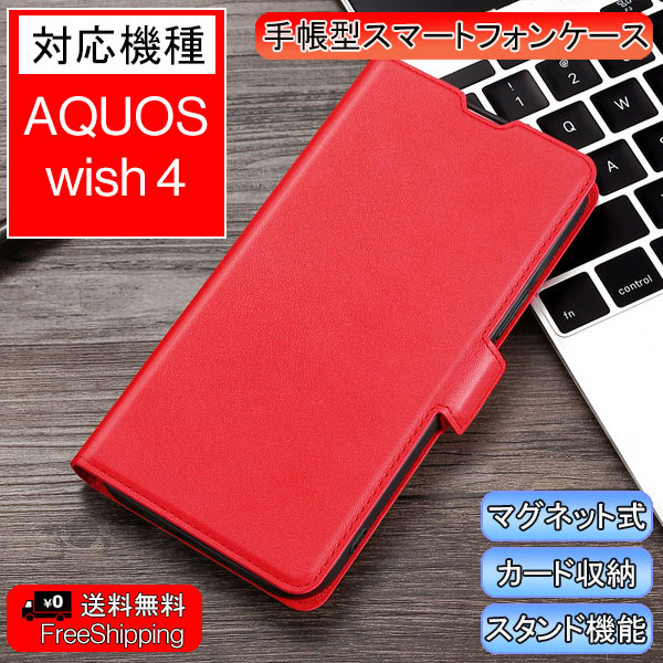 | 商品名 | AQUOS wish4 用 スマホケース アクオス ウィッシュ 新品 手帳型 レザー カード収納 携帯ケース 無地 シンプル レッド |