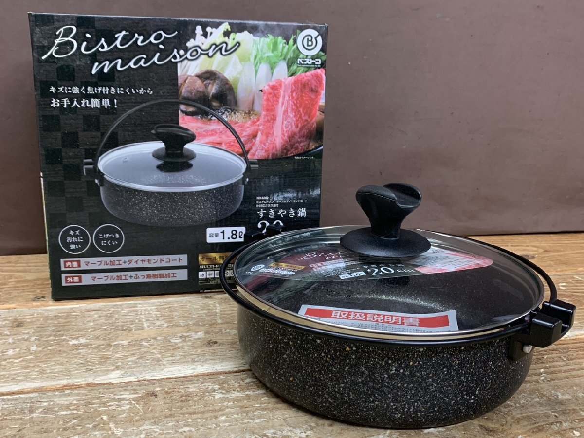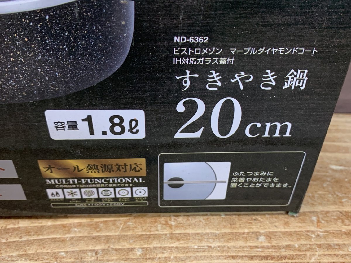 【N-7949】未使用 20cm すきやき鍋 1.8L マーブルダイヤモンドコート オール熱源対応 ガラス蓋付 ND-6362 東京引取可【千円市場】
