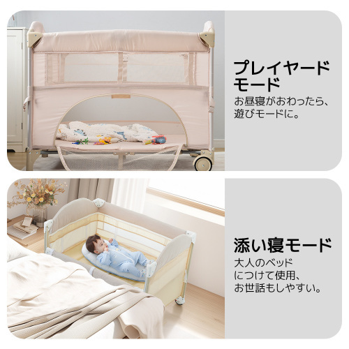 • 商品の説明: ◆ 01お部屋に馴染むオシャレなデザイン どんなお部屋にも馴染みやすいナチュラルなカラーがオシャレ インテリア性の高いデザインにこだわりました 大きくなったらプレイヤードとして マットを下段に取り付けると、プレイヤードになります。 ◆ 02収納に便利 たたみ方は簡単 床面の中央にあるバンドをつまみ、引っ張りあげながら畳んで、収納袋に入れる こんなにコンパクト 使わない時はらくにたたんで収納できます。 収納時はマットを取り出してから、たたんでください。 詳しいたたみ方については取扱説明書をご参照ください。 ◆ 03どこでも気軽に設置できて移動や持ち運びも便利 下部にキャスターが付いているので、お家の中での移動がラクラク 持ち上がると移動し、置くと止まり、安全で移動しやすい ◆ 04収納スペース満点 側面バック付き 背面バック付き 赤ちゃんのおもちゃ、おむつ、日用品などを収納できます。 ◆ 05簡単組み立て ツールは不要で、3分であっさりと組み立て完了 ◆ 06付け外しファスナー式お昼寝シート お昼寝シートはファスナーで取り外し可能、さらにプレイヤードモードに簡単チェンジ ◆ 07後退防止の特別ファスナー 赤ちゃんの安全を守るために、後退防止の特別ファスナーを採用していますので、ファスナーをあげる時は真っすぐではなく、すこし上がってあげてください。