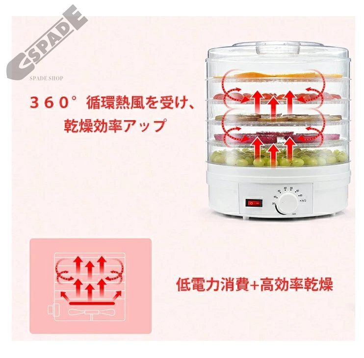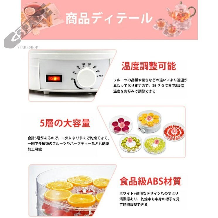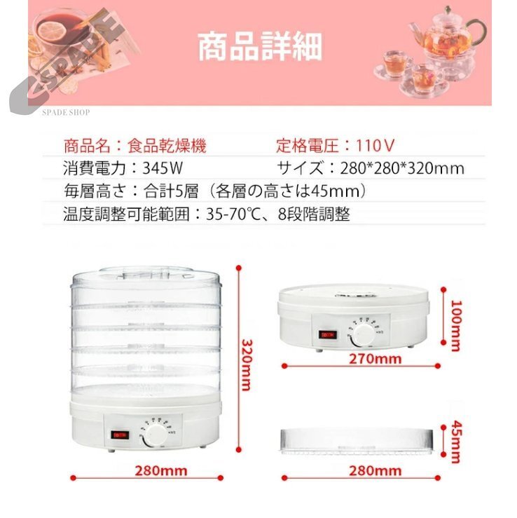 | 商品名:食品乾燥機 定格電圧:110V 消費電力:345W 毎層高さ:合計5層(各層の高さは45mm) 温度調整可能範囲:35-70℃、8段階調整 サイズ:280*280*320mm |