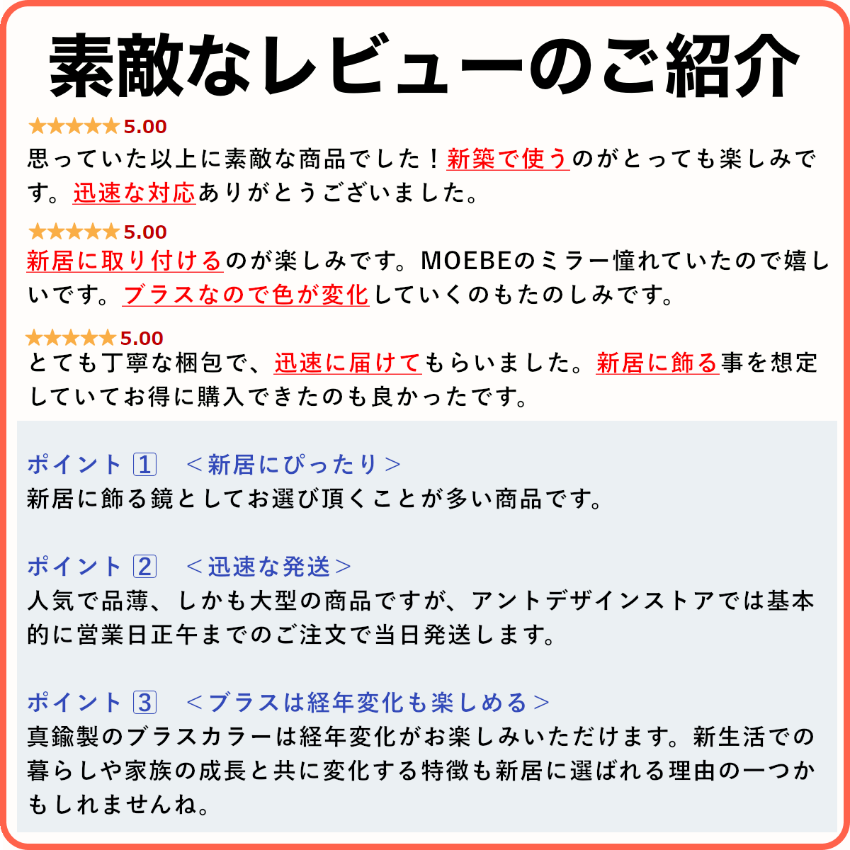 大きなウォールミラーは、玄関などのインテリにも実用的でおすすめです。新築祝いや結婚祝いなどのプレゼントにも最適ですね。もちろん当店のMOEBE ムーベは全て国内正規品です。