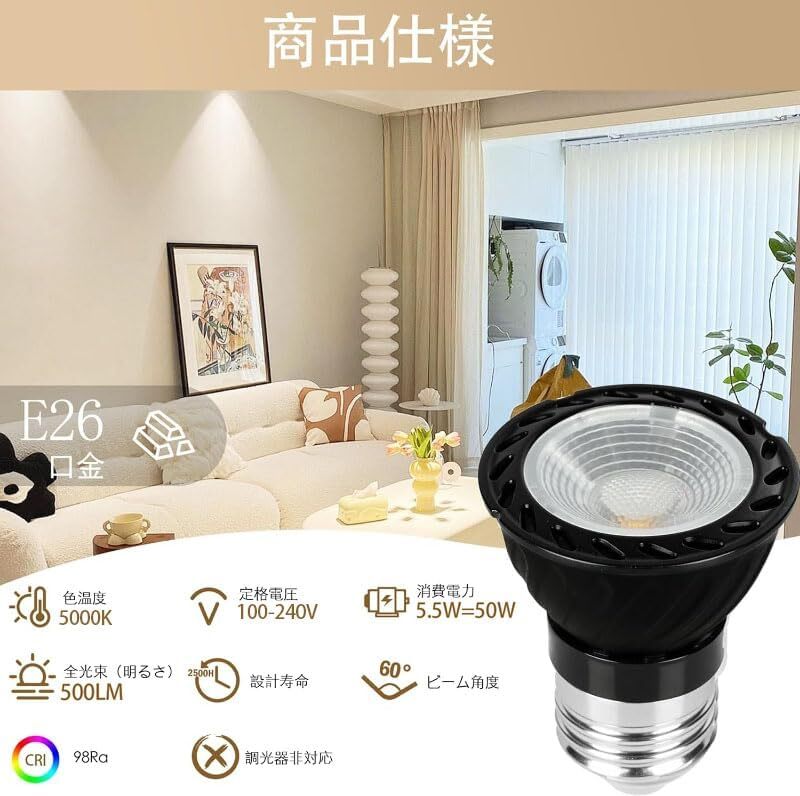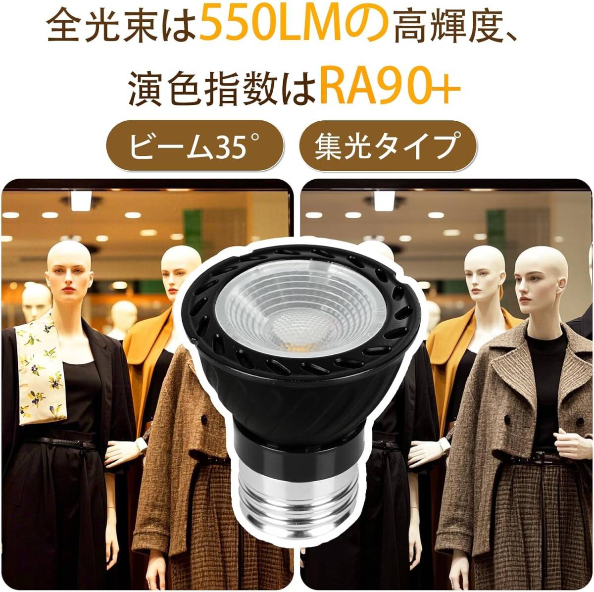 全光束:550lm/定格電圧:AC100-240V/広角タイプ:36°/高演色性:Ra90。
