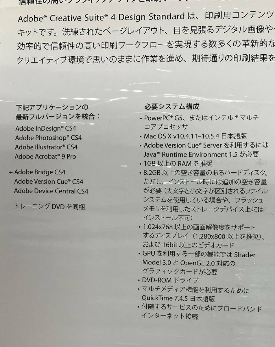 DVDに下記アプリケーションを収録。完品。DVD、マニュアル、パッケージ。シリアルキーはパッケージ裏面に記載。 ・indesign ・photoshop ・illustraator ・Acrobat ・Adobe Bridge ・Adobe Version Cue ・Adobe Device Central シリアルナンバーで起動確認。 Mac os 10.4.11〜10.5.4