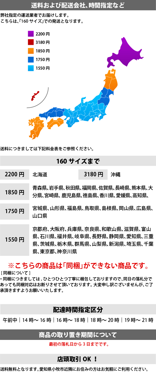 購入手続き時に送料5,000円と表示された場合は、ご落札後当社から正しい送料をご連絡いたします。