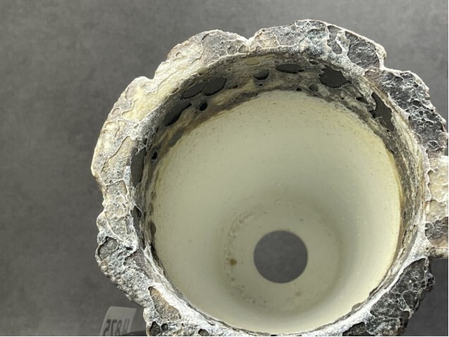 釉層は高温焼成によって剥離し、褐鉄の胎土が露出。そこに灰色の火山皮膜釉が絡みつき、まるで長い年月を経て風化した金属装甲のような姿を見せます。