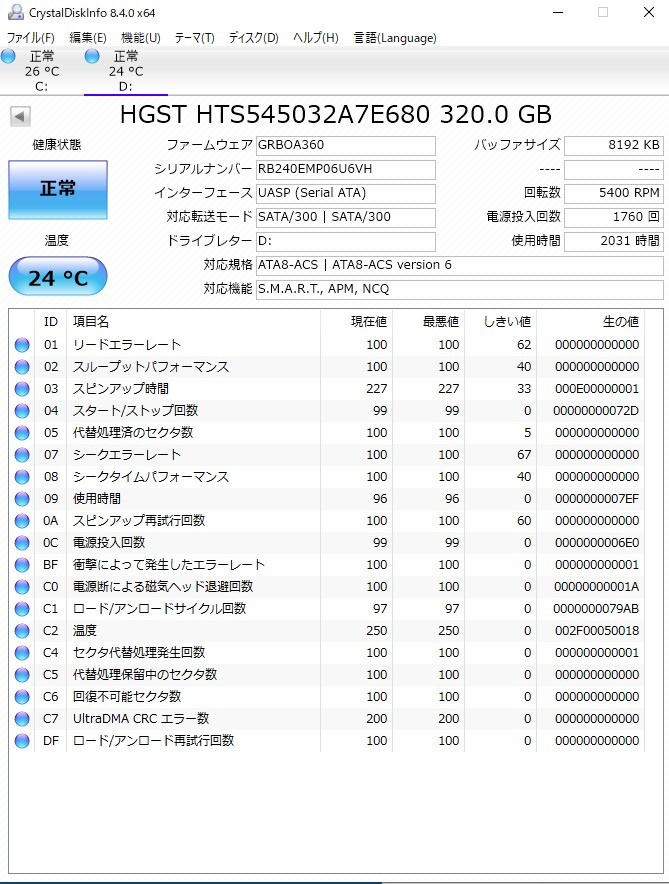 詳細はCrystalDiskInfoの数値画像でご確認ください。