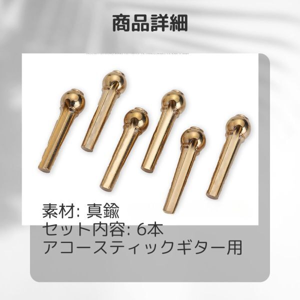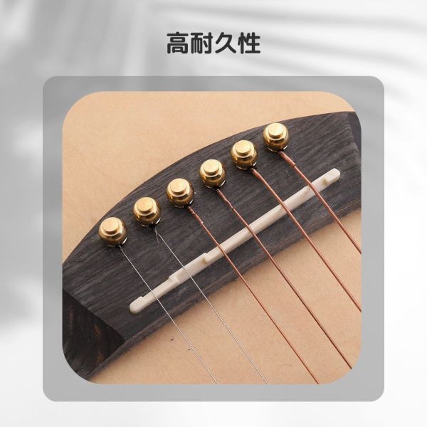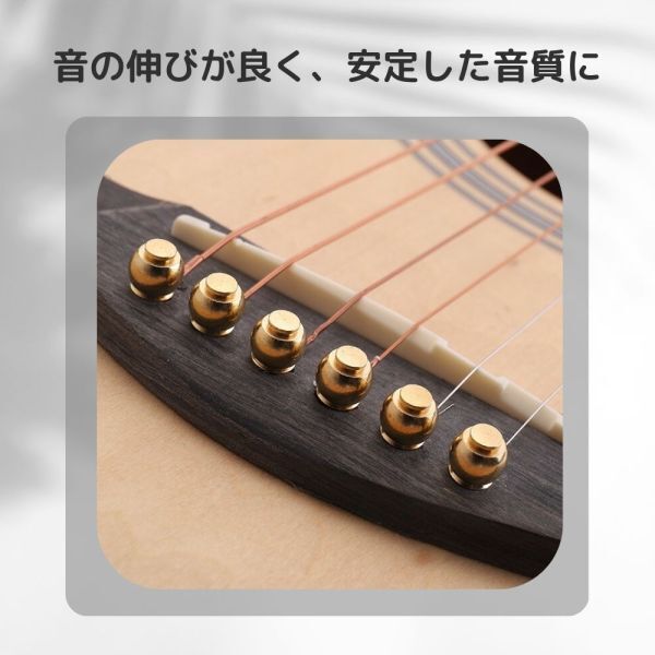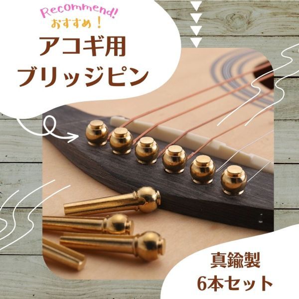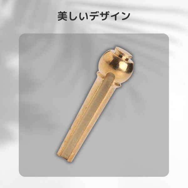 真鍮製のアコースティックギター用ブリッジピンの6本セットです。通常、ブリッジピンは牛骨やプラスチック製が多いですが、真鍮製のこのピンはサスティーン(音の伸び)が向上し、音がよりハッキリと安定します。見た目にも優れ、ピンの輝きがアクセントとなり、耐久性もプラスチック製より優れています。ギターの音質を向上させたい方におすすめです。