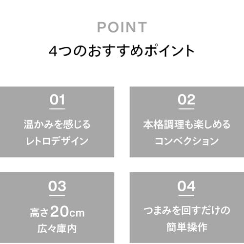 【チキンのパリッと感を生み出す 250度まで選べる温度調節機能。】デザインだけでなく、もちろん実力は本格的。ヒーターは上下、上、下と選べる上に、温度調節は最高250度まで選べるので鶏の皮もパリッと仕上ります。庫内の高さも20cmあるのでシフォンケーキなど高さのあるお料理も得意です。