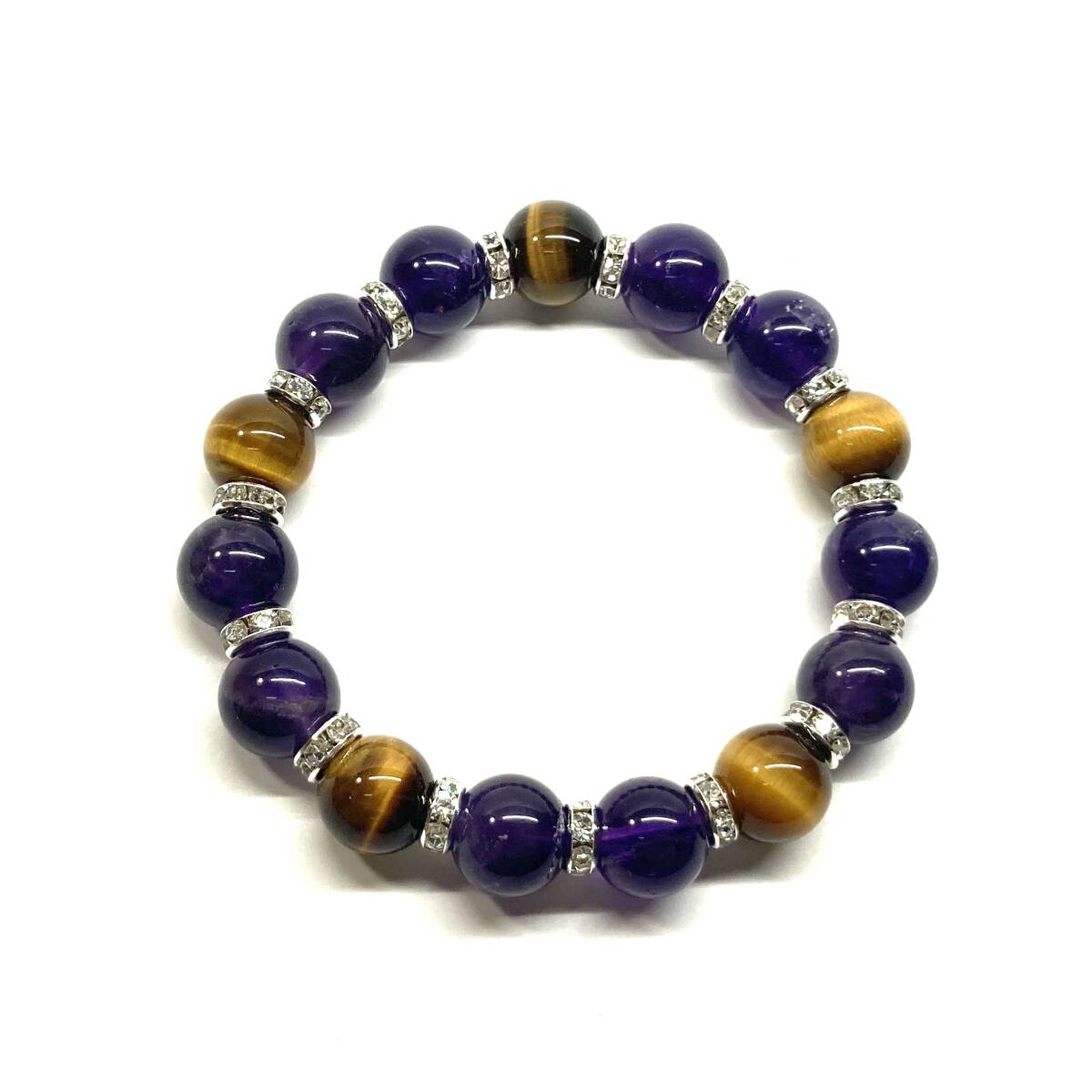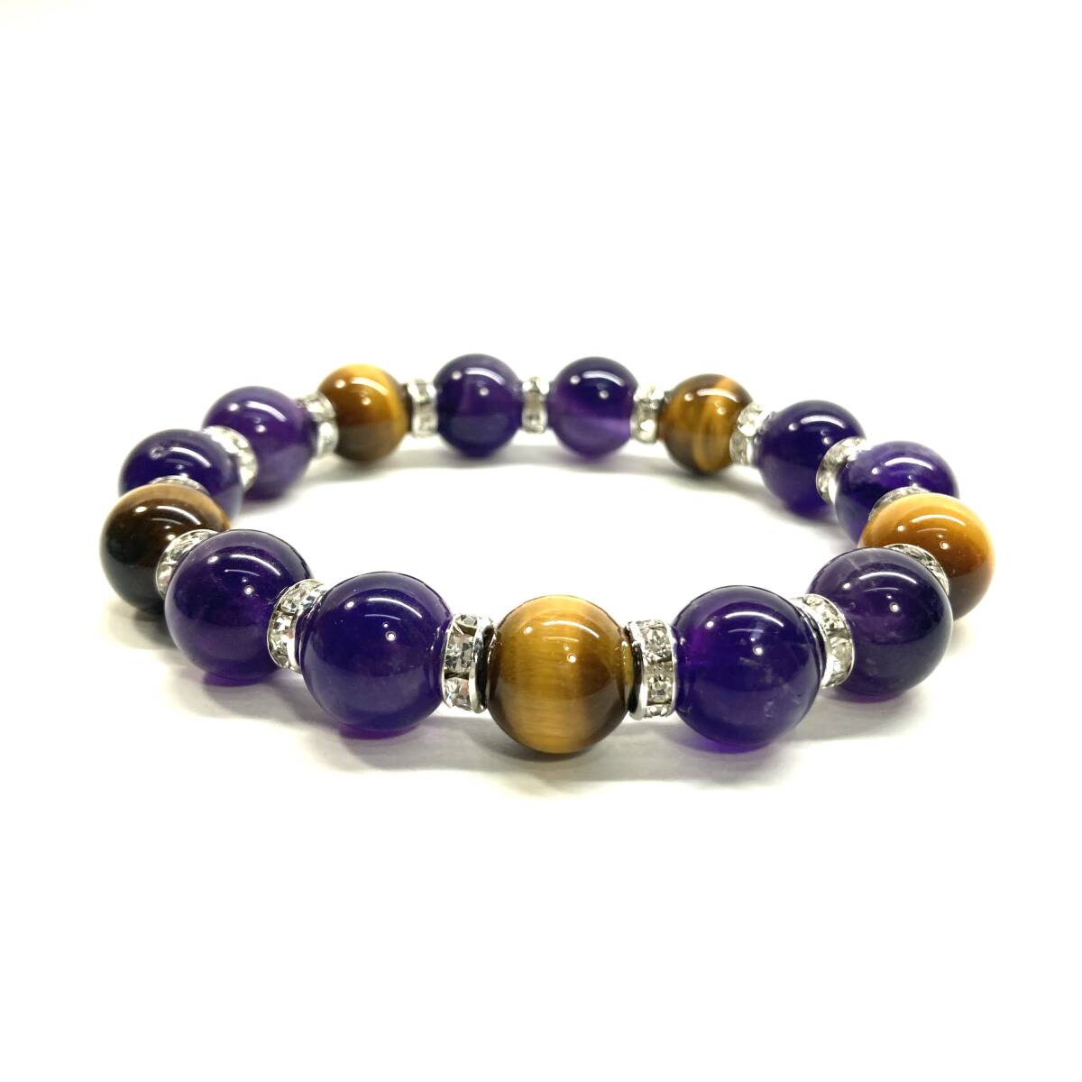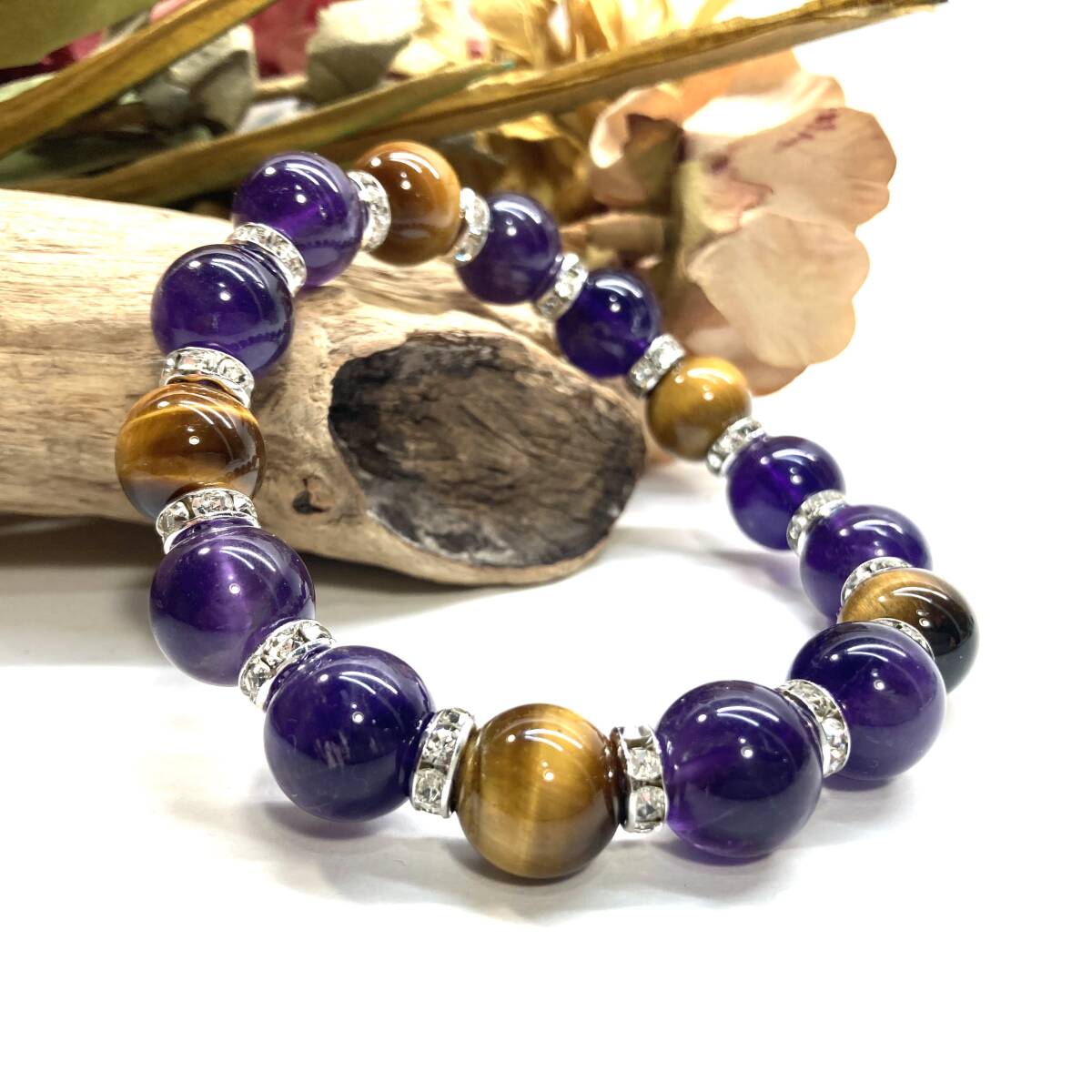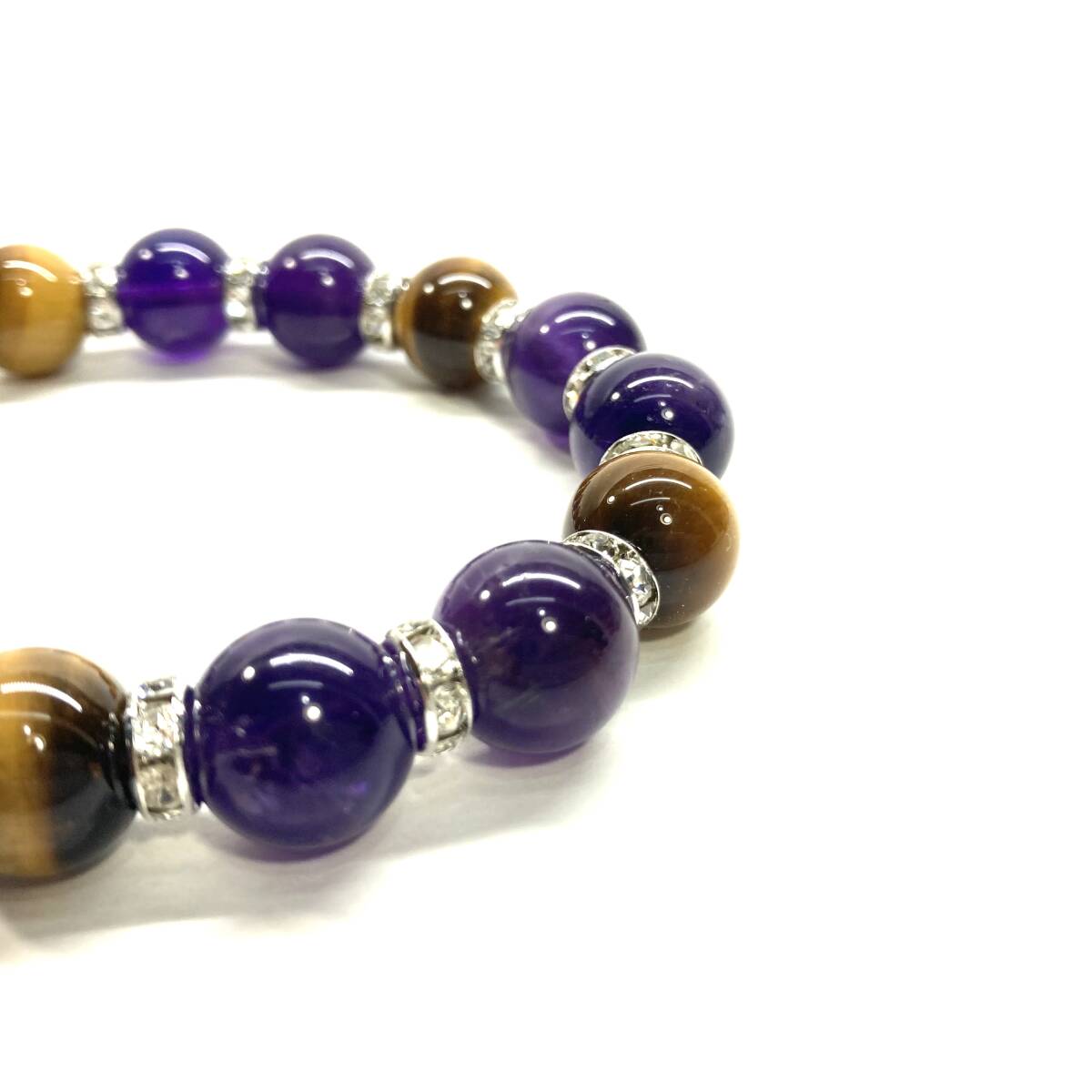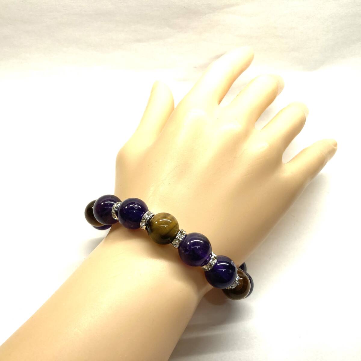 こちらは、タイガーアイとアメジストを組み合わせたパワーストーンブレスレットです。間にはロンデルを挟み高級感あるデザインに仕上げております。石大きさは12mm玉を使用して内周約18cmです。気になる方は是非この機会にどうぞ。