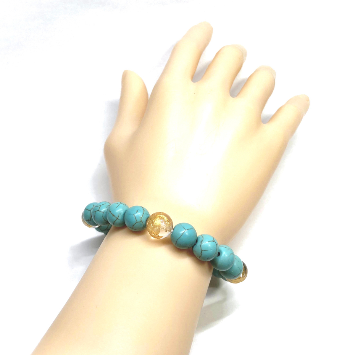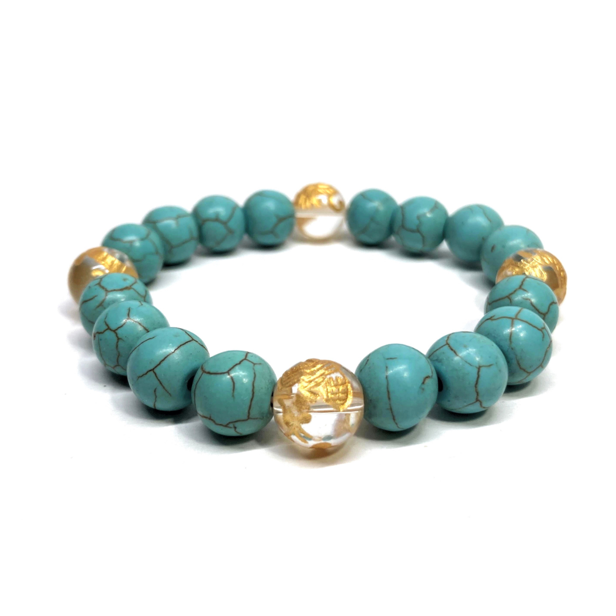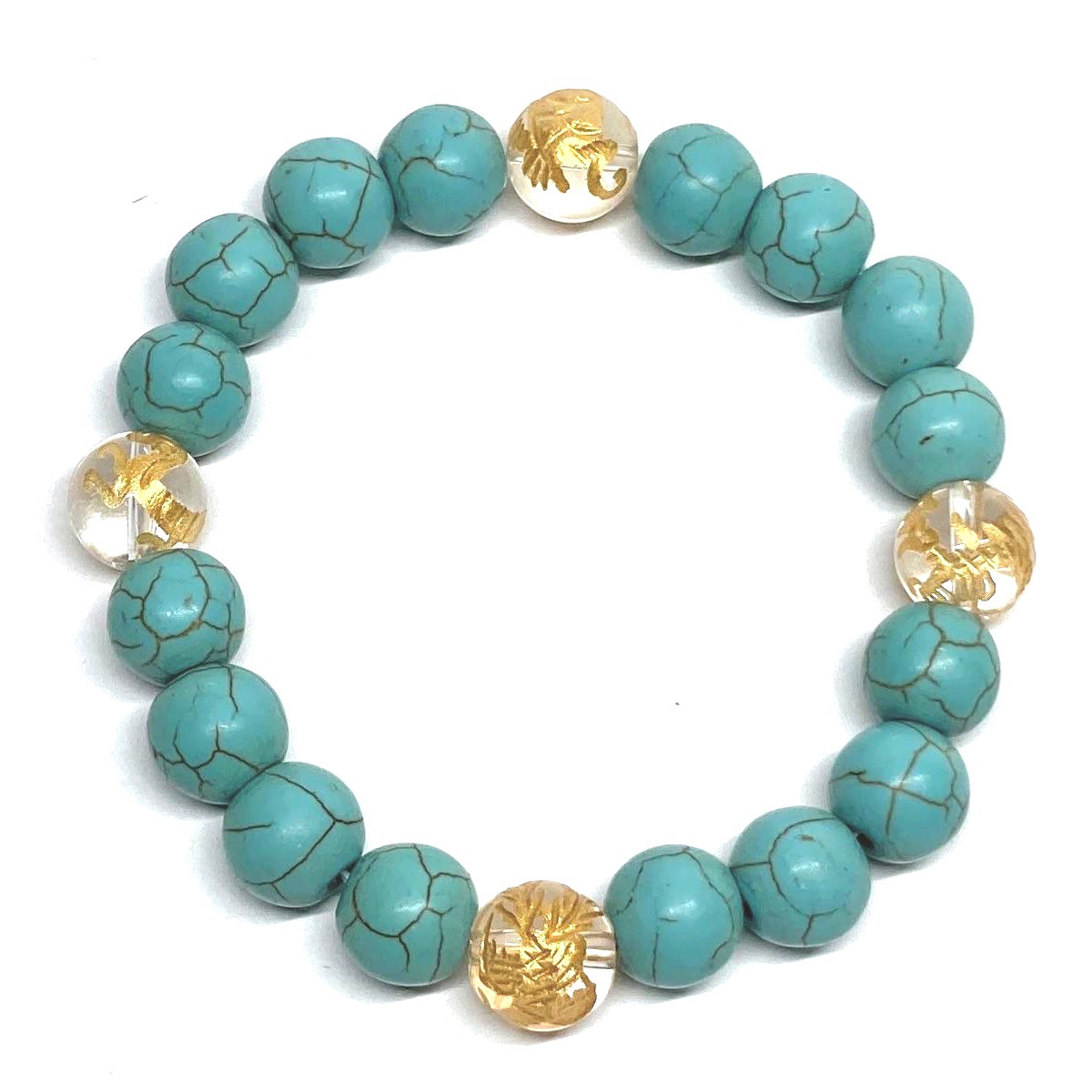 10mm 四神獣金彫水晶×ターコイズ パワーストーン ブレスレット天然石 運気上昇 開運 金運 恋愛運 青龍 白虎 玄武 朱雀 #2 ☆