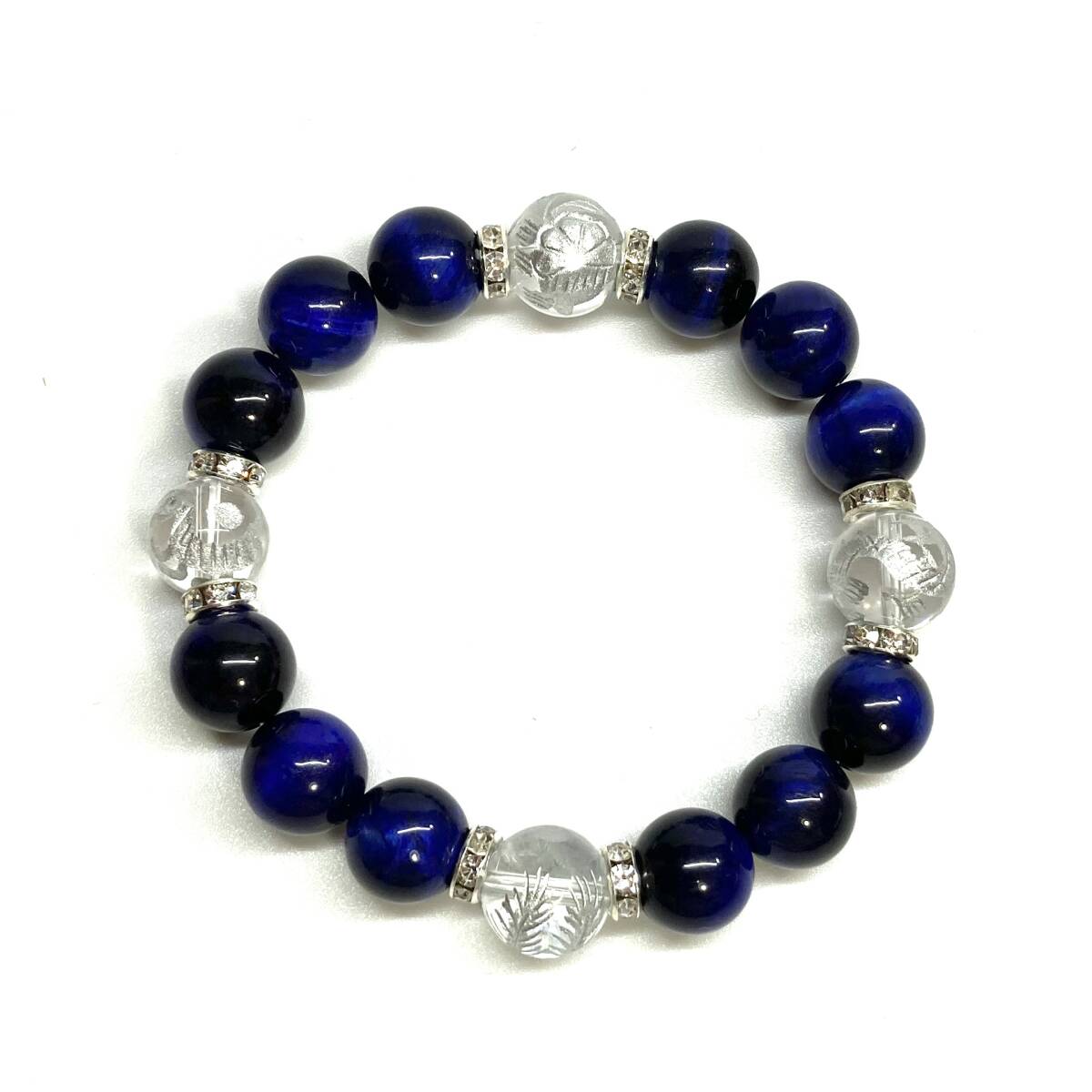 こちらは、四神獣銀彫水晶とブルータイガーアイを組み合わせたパワーストーンブレスレットです。四神獣は、中国の伝説で4つの方向(東西南北)を守護する神聖な神。四神獣、厄災から身を守り、多くの運気を呼び込むと言われております。石大きさは程よくインパクトのある12mm玉で内周 約17cmです。 数に限りがございますので気になる方はお早めにどうぞ。