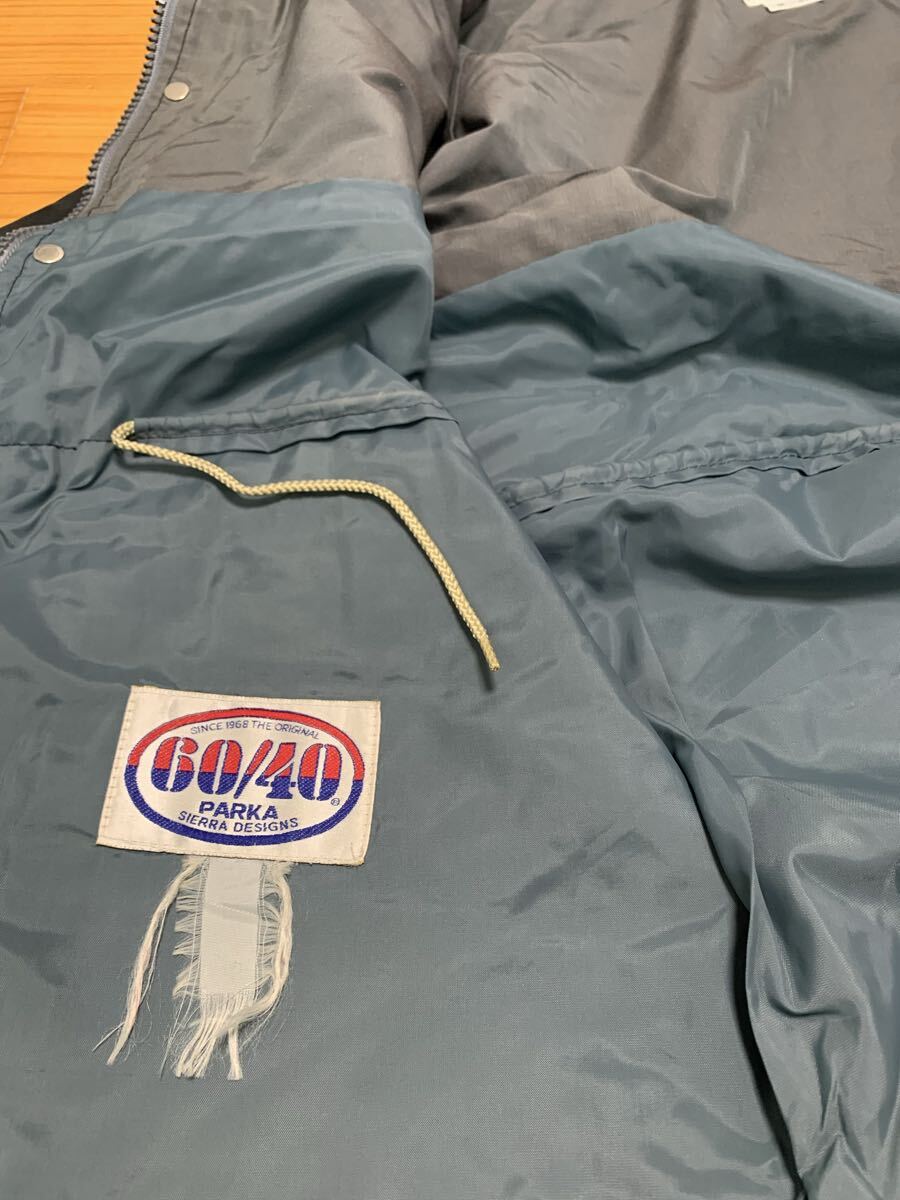 90年代に新品で購入した60/40クロスのマウンテンパーカです。勿論アメリカ製です。カラーは貴重な黒xグレーです。インナーの首元に黄ばみ、アウターはフェードが始まっています。コットナイロン独特の迫力あるフェード(退色)を、これからお楽しみ頂けると思います。