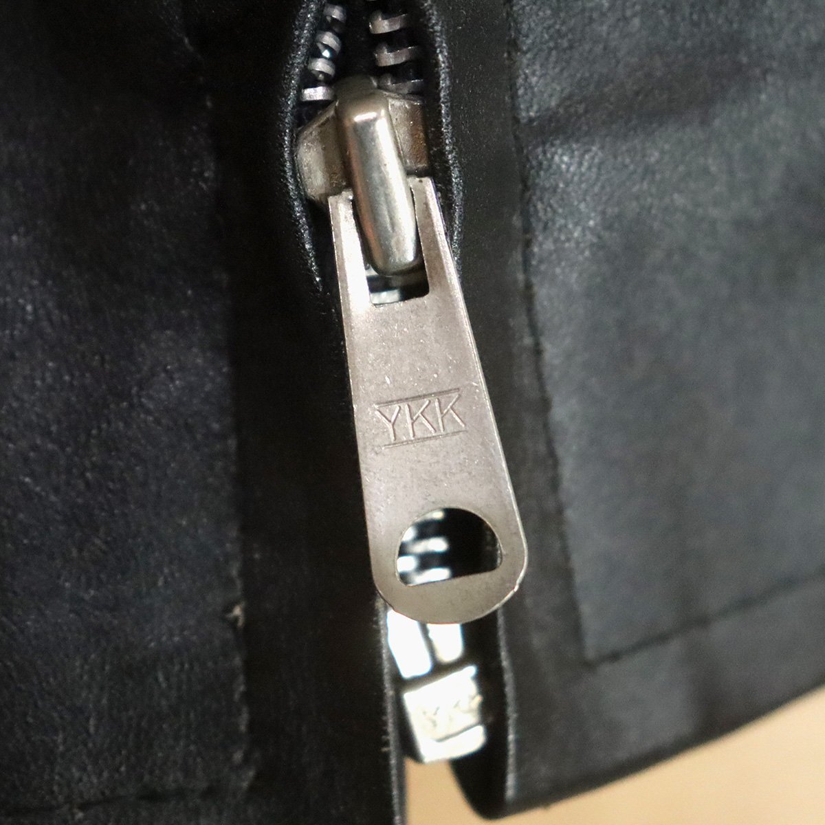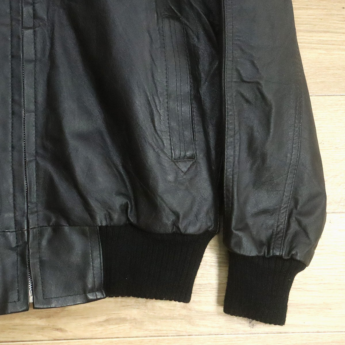 中古品です。使用感があります。襟に擦れと剥がれ、裾リブにホツレがあります。タグがないため素材(本革か合皮か)は不明です。