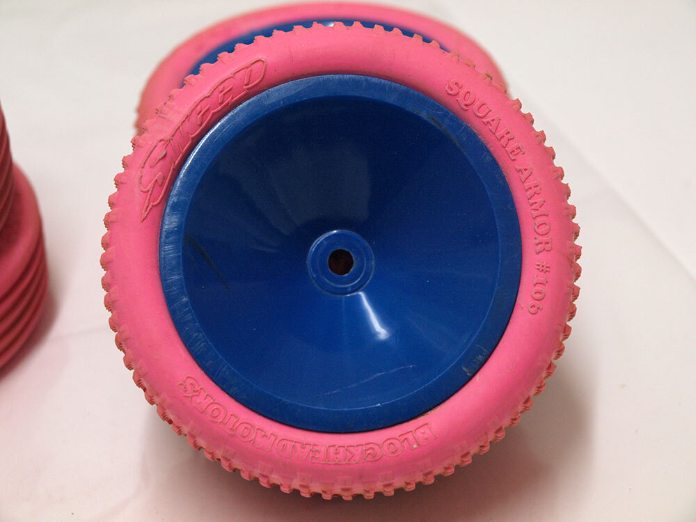【M1884C】2WDバギー用 ピンク タイヤ 前後セット 中古品 ジャンク(Sweep ブロックヘッド SQUARE ARMOR TRI-RIB RC10 アソシ ラジコン)