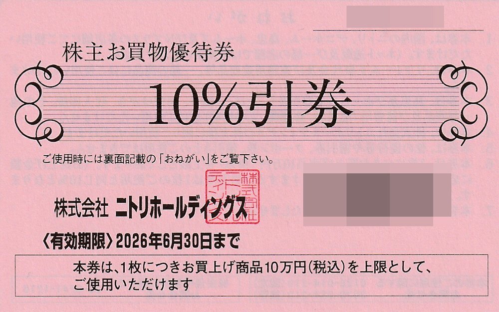| 出 品 商 品 | 株式会社ニトリホールディングス 株主お買物優待券 10%引券×3枚 (3枚セットの価格となります) |