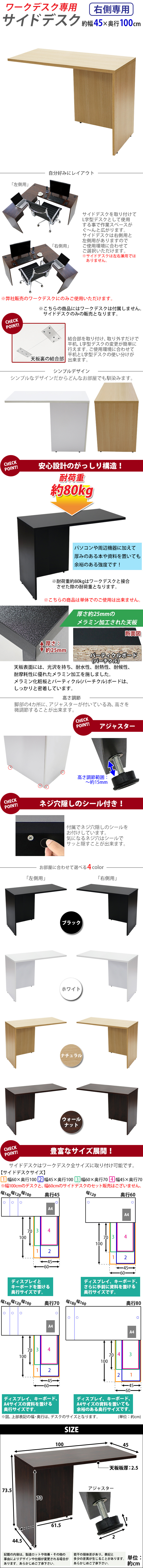| 商品紹介 | ■弊社販売のワークデスクにのみご使用いただけます。 (こちらの商品は、弊社販売のワークデスクworkdesk,desk07,desk11にのみ使用可能です。) ■作業スペースを広く確保出来る、ワークデスク専用のサイドデスクです。 ■幅が約45cmのタイプです。 ■付属のプレートでワークデスクとサイドデスクを固定するだけの簡単接合。 ■会議室や事務所等、オフィス家具として様々なシーンでお使いいただけます。 ■天板には、メラミン加工を施しています。 ■天板裏の結合金具、ネジ穴隠しのシール付き。 ■アジャスターで高さの調節が可能です。(高さ調節範囲〜約15mm) ※こちらの商品は、組立て式です。組立てにはプラスドライバーが必要です。お客様でご用意ください。 ※組立図が付属します。 ※サイドデスクの取り付けはデスクの右側専用となります。 ■材質:パーティクル(パーチクル)ボード(メラミン加工)(本体)、プラスチック(アジャスター) ■重量:約16kg ■耐荷重:約80kg(ワークデスク接合時) ●新品商品ではありますが、輸入商品の為、多少の擦り傷などがある場合がございますので、ご納得の上ご購入下さいませ。 ●ご購入後、お客様ご都合によるご返品、ご返金等は一切お受け致しておりません。 ●本商品を使用した際に発生したトラブル、事故につきまして、当社は一切の責任を負いません。ご使用に関しましては、全て自己責任にてお願い致します。 ※カラーはナチュラルとなります。 |