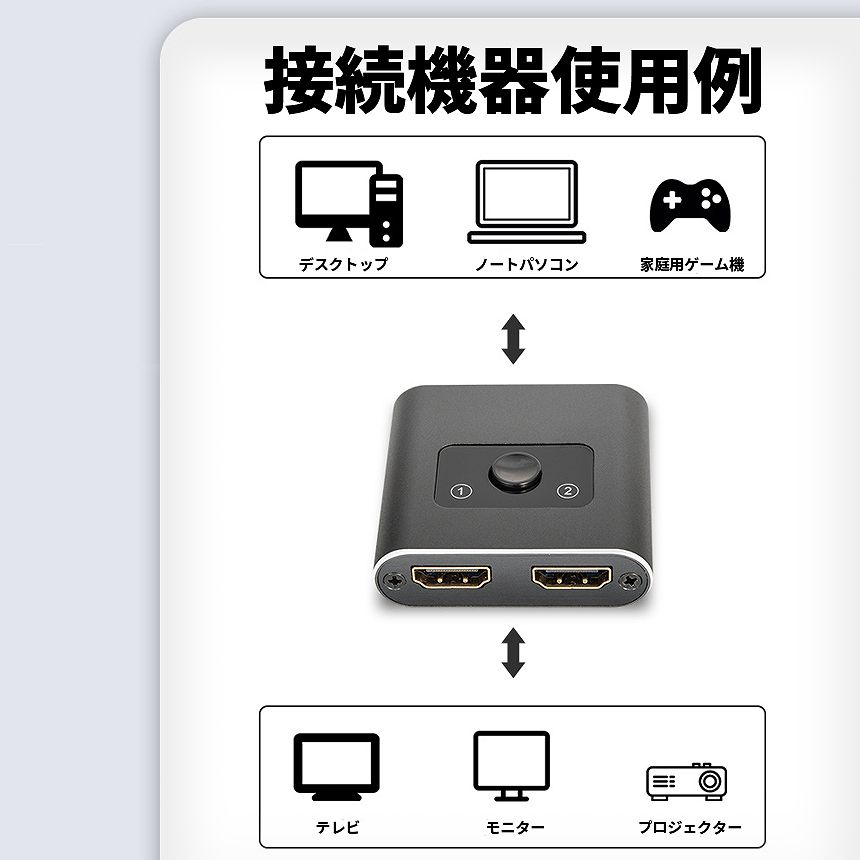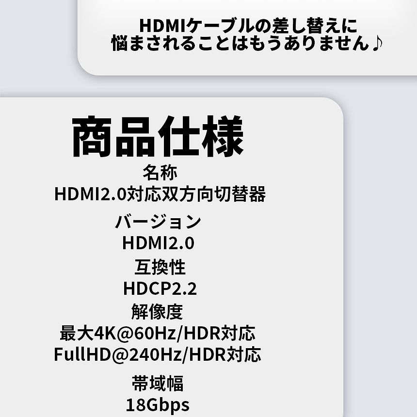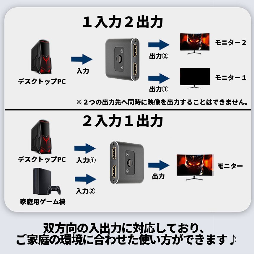 | 送料無料!!! 送料及び下記のご案内をご確認の上、ご入札お願い致します。 離島地域を除く九州、四国、本州まで送料無料。 ※北海道は+1000円、離島地域及び沖縄県は+3000円にて承ります。(発送前に加算) ※画像内にカラー及びサイズ等の選択が可能と記載がある場合がございますが、 お届けする物はタイトルまたは商品説明文に記載の物です。 ★※注文後のカラー変更や異なるカラー・サイズ指定等は一切承っておりません。 ※★※仕様(ロゴデザイン/ロゴ有無等も含む)は予告なく変更する場合があります。 ※多少の汚れや小傷がある場合がございますがご了承ください。 梱包は簡易包装ですので、箱の角落ち等はご了承願います。 【商品説明】 双方向の入出力に対応したHDMI切替/分配器! プレミアムハイスピードHDMI2.0対応により、4K解像度でも60Hzの出力に対応♪ 入力元/出力先をボタンひとつで切り替えることができ、 ケーブルを差し替えるなどの手間はもうかかりません! 双方向の入出力に対応しているので ご家庭の環境に合わせた様々な組み合わせで映像を出力することができます! ※1つの映像を2つの出力先に同時に映像を表示することはできませんのでご注意ください。 ※HDMIケーブルは付属していません。 =========== 【商品仕様】 個数:本体1つ バージョン:HDMI2.0 対応解像度:4K@60Hz、FullHD@240Hz HDR対応 サイズ:画像を参照 ※モニターにより色合いが若干前後する場合がございます。 ※輸入品ですので多少の臭いやスレ傷、汚れはご了承ください。 ※サイズは実寸ですが若干前後する場合がございます。 ※在庫情報の表示については万全を期しておりますが、 注文のタイミングにより在庫欠品の場合は別途当店からご案内致します。 =========== ※詳細は画像にてご確認ください ![]() ![]() ![]() ![]() ![]() ![]() ![]() |