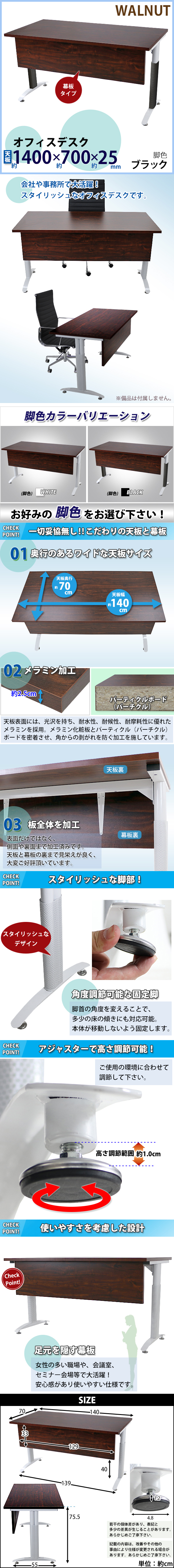 | 商品名 | 送料無料 オフィスデスク デスク 幕板付 約W140×約D70×約H75.5 約W1400×約D700×約H755 ウォールナット 平机 ワークデスク 事務机 会議テーブル パソコンデスク PCデスク 長机 会議机 会議デスク 事務デスク オフィステーブル オフィス家具 会社 事務所 deskt016140wa |
