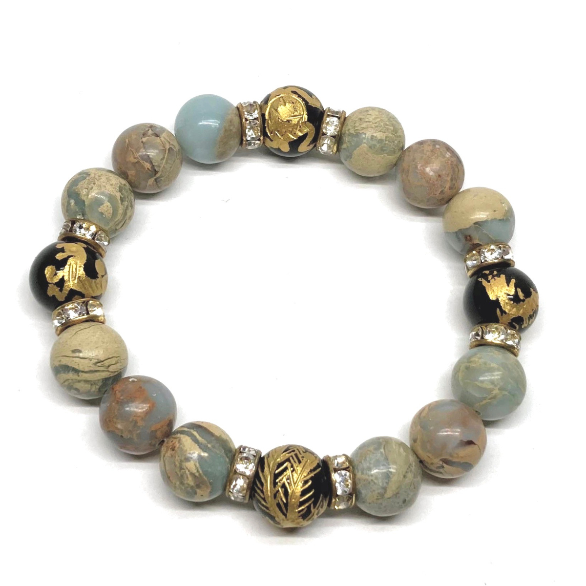 こちらは、四神獣金彫オニキとインプレッションストーン組み合わせたパワーストーンブレスレットです。四神獣は、中国の伝説で4つの方向(東西南北)を守護する神聖な神。四神獣、厄災から身を守り、多くの運気を呼び込むと言われております。石大きさは程よくインパクトのある12mm玉で内周 約17cmです。 数に限りがございますので気になる方はお早めにどうぞ。
