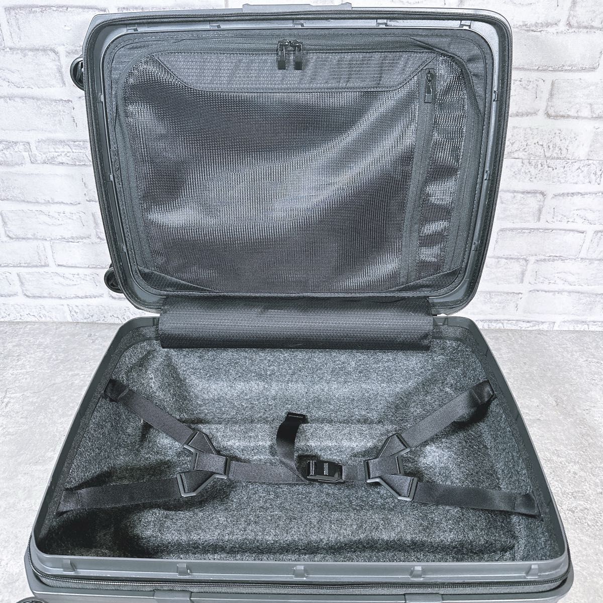 特長2:柔らかいフェルト地が荷物への振動を和らげ静かな取り回しを実現。個人情報は、ラゲッジ背面の一体型のIDスロットに入れて見えないように保護。荷物をしっかり固定する、調節機能を備えた内部のコンプレッションシステム。一体型フットにより、バッグを立てかけることなく置くことが可能。