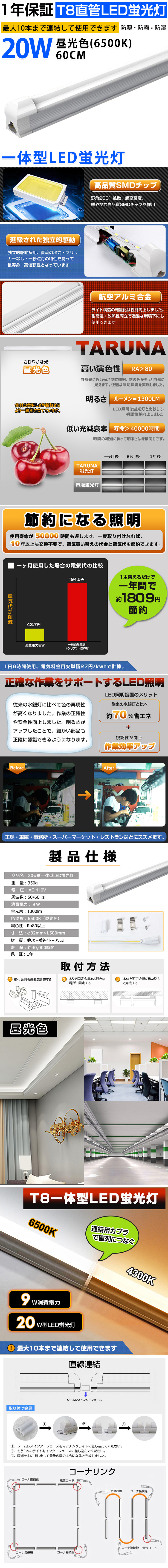一体型直管形蛍光灯20W形対応、1300ルーメンLED蛍光灯です。発光効率が高い! ◆優れたLEDチップ採用: 驚異的な照射能力と耐久性が持ってます。ムラなく均一の発光で、すっきりと対象物を照らします。 ◆発光源は精銅スタンドを採用します: 熱伝導性と導電性は普通より優れた。チップの発熱量は最小限になります。高輝度低光減衰の特典:3000時間で光減衰率は2%左右です。優れた静電気保護で40000時間以上の長寿命をもつ。 ◆取付簡単: 電源配線をつなぐだけで使用可能(電源接続工事が必要、連結使用の場合最大10本まで)。 ◆電気代カット: 消費電力:9W。従来品から1本だけ替えるで一年間で約1809円節約できます。 ◆驚きの長寿命: LEDの放熱率が少ない、光衰えも低い、寿命は一層長くなります。 一度取り付けなれば、10年以上も交換不要で、電気買い替えの代金と電気代を節約できます。 ◆航空アルミを採用: 航空アルミニウムを採用して散熱性能は強くなり、熱で変形しにくいです。 ◆安全性が高い: LED蛍光灯は低電圧駆動を採用して、安全性が高い。 ◆高透明度材料: 高透明度拡散型乳白色のPC材料を利用します。耐高温、長期間使用することができます ◆広い使用範囲: 商品棚、ショーケース、陳列窓、トイレ、台所、ホテル、広告、レストランなどに適合! 【注意事項】 ◆蛍光灯ランプを切り替える前、電源を必ず切ってください。 ◆取り外す際、蛍光灯が冷えてから行ってください。 ◆既存の蛍光灯を取り外しの際、ランプ両端の口金を触らないでください。 ◆グロースタータ式場合、グローランプ(点灯管)は必ず取り外しください。電子安定器を取り外さなくても大丈夫ですが、無駄な電力を消費します。 ◆ラピッドスタート式&インバータ式の場合、電子安定器を必ず取り外しください。 ご入札前に、ぜひ下記の情報をお読みください。 |