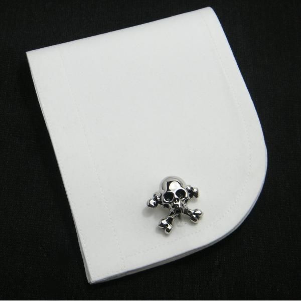 スカル、ドクロ、しゃれこうべ、、、本来は死を意味する、怖いものなんですが、不思議とカッコよく思えるのはなぜでしょう?クロスした骨の上に頭が乗っているデザインといい、程よい重厚感といい、とてもお洒落なドクロ・カフスです。サイズ=横:20x縦:20×厚み:10(mm)素材=ロジウムコーティング