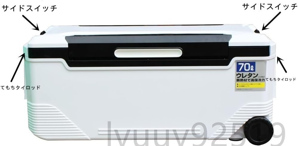 ●軽量・コンパクトなポータブルサイズ。 ●PPの断熱材採用、保温効果が向上です。 ●座れる頑丈マッスルボディ ●サイドハンドルと静音キャスター付きで持ち運び楽々 ●簡単に開閉可能な水栓付き 【商品の説明】 商品状態:未使用品 容量:85L 断熱構造:発泡ポリスチレン/PP 保温時間:約150h 機能および付属パーツ:ハンドル、水栓、滑り止めゴム、サイドロック、キャスター、肩ベルト 用途:クーラーボックス 釣り 用 クーラーボックス フィッシングクーラー