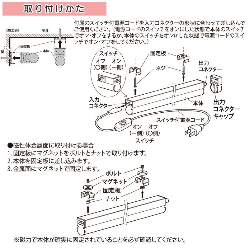 固定用部品(固定板・ネジ・プラグ・ボルト・ナット・マグネット×各2個)、取扱説明書