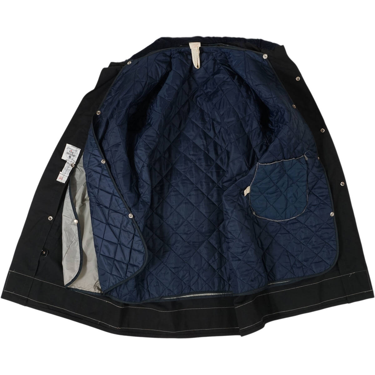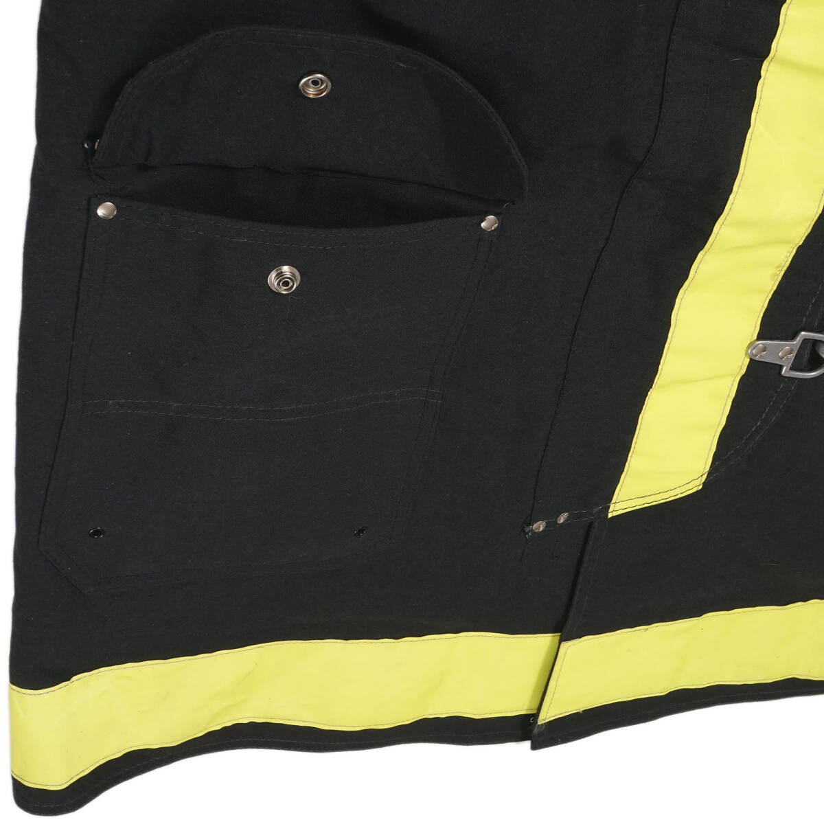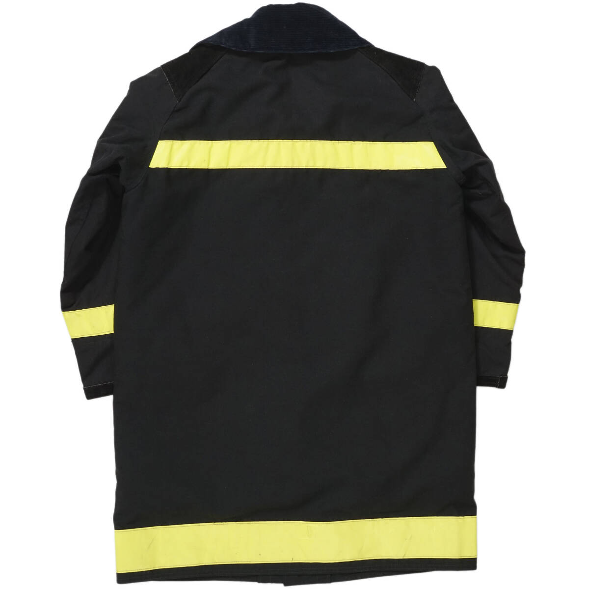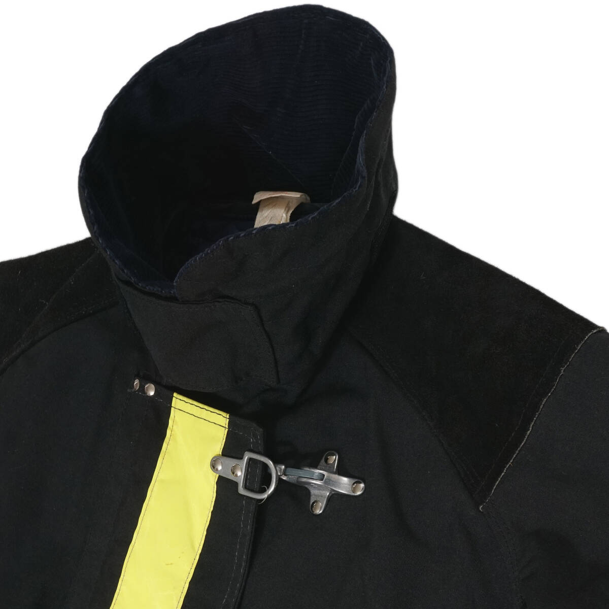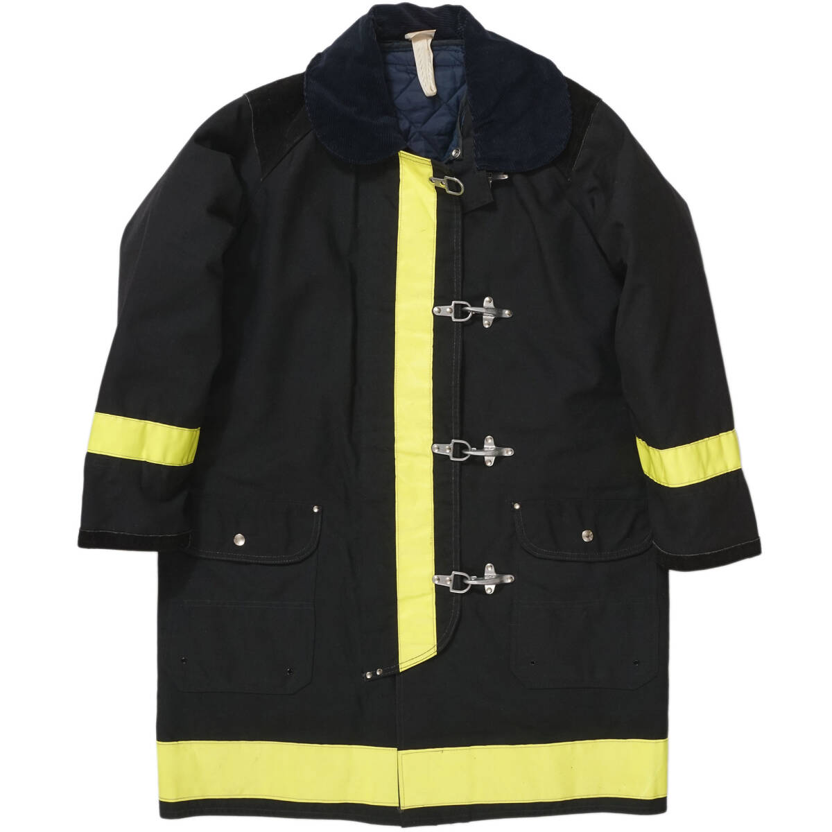 90年代頃まで良く見られたコーデュロイの襟に、現在では防火服規格に合わないため作られない膝丈など、時代を感じさせる防火服です。4つのうち一番上のフックだけが逆バージョンになっているのも珍しいポイントです。