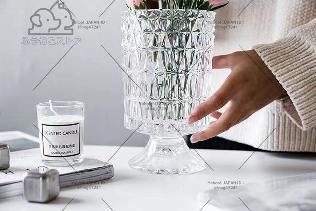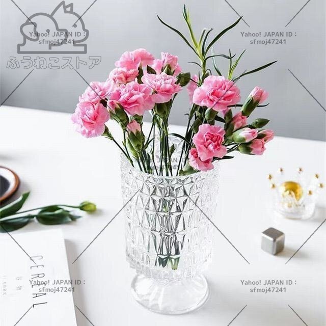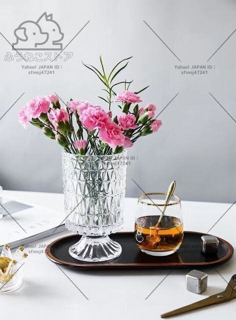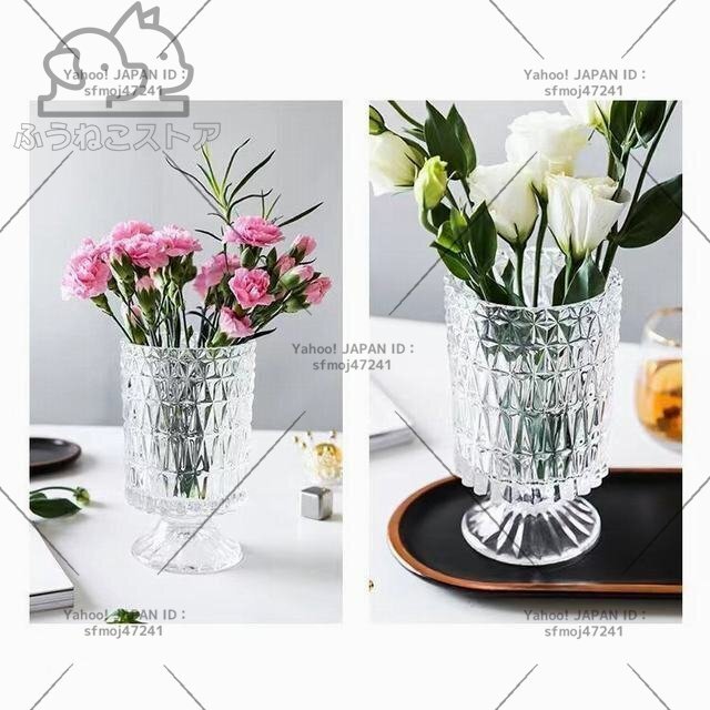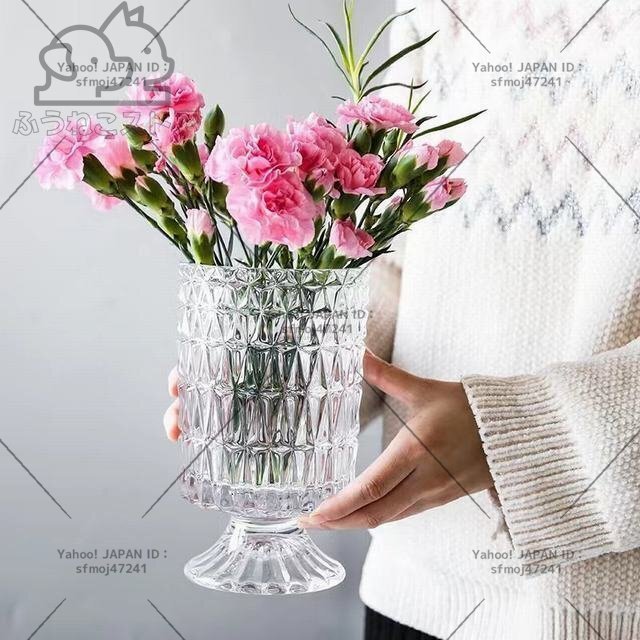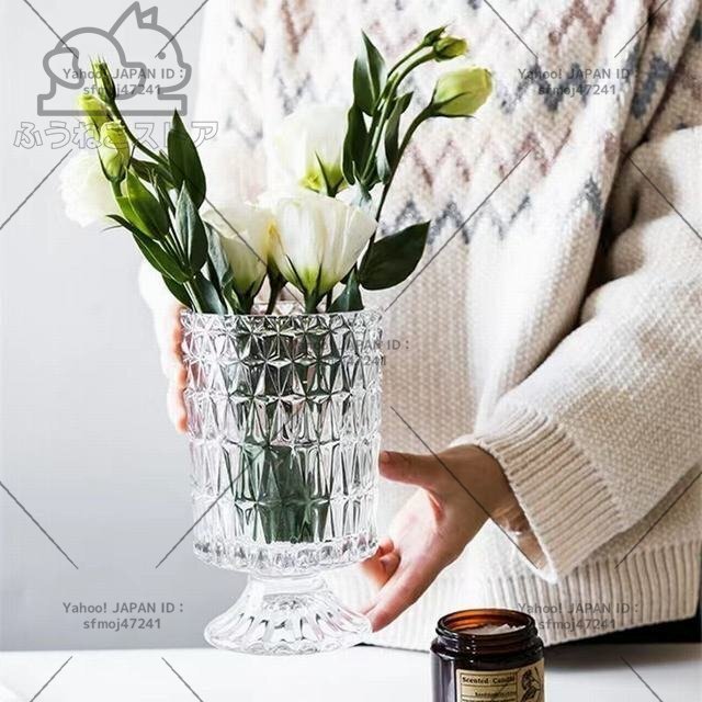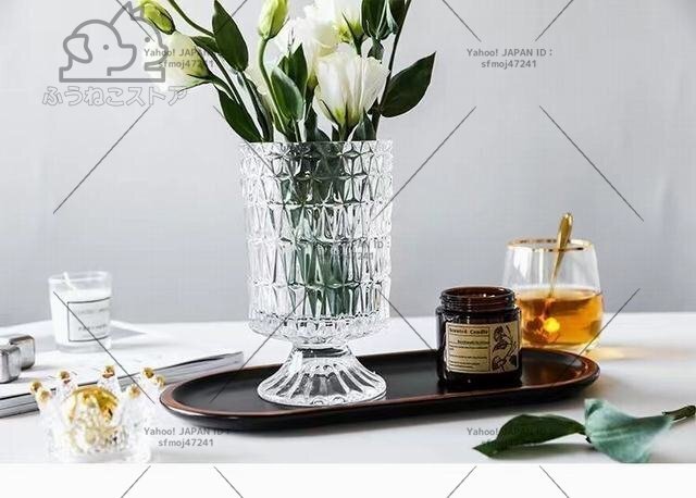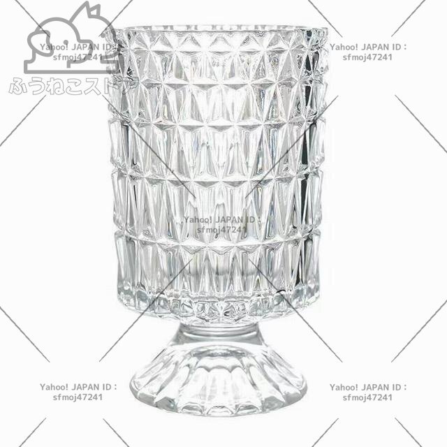 材質: ガラス サイズ:掲載サイズ表をご参照ください。 ガラスをカット風にデザインしたシンプルでおしゃれなフラワーベースです。 透明なのでどのようなお花を生けても美しく映えます。お部屋や食卓、窓際などに飾れば空間を華やかに演出してくれます。 全体高級感が溢れて、飾るだけで絵になる美しさ。お花と共に輝きます。 光に当たるときらきら輝きます。花入れても、そのままで飾っても、部屋に芸術的な雰囲気があります。 コップ型の花瓶 吹きガラス技法の一輪挿しはちょっと厚めの仕上がりで、高級感に溢れています。底の部分に重心があるので安定感があります。 高級感と存在感のあるベースはオブジェとしてインテリアのアクセントにもオフィスのカウンターや応接で、ホテルやレストランのエントランスで様々な場所を華やかに演出します。花器として、インテリアのオブジェとして、暮らしをアーティスティックに演出してくれる逸品です。