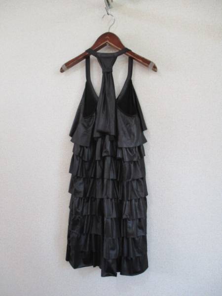 | 商品紹介 | ティアードフリルがオシャレなキャミソールワンピースです。 背中上を輪でまとめた形になっています。 色は少し薄い黒(墨黒)でやや光沢があります。 《素材》 ポリエステル100% |