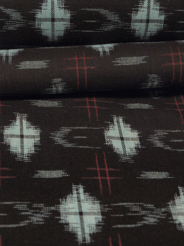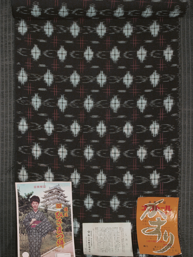 濃藍(こいあい)色の地に、赤紅色の井桁(いげた)と水色の琉球絣調の鳥(トゥイグワー)の文様が絣で織り込まれている、綿の備後絣の反物です。 アンティークに近いお品です。幾何学的な文様がモダンで、挿し色の赤紅色も小粋な印象です。 未仕立て未使用保品です。外周部の端が左右にかけてうっすらとヤケ気味のような感じがありますが、あまり判別はつきません。綴じられているため、中までは確認できませんが、目につくしみやよごれ、褪色などのダメージはなさそうで、きれいな状態と思われます。 |
