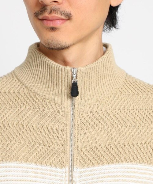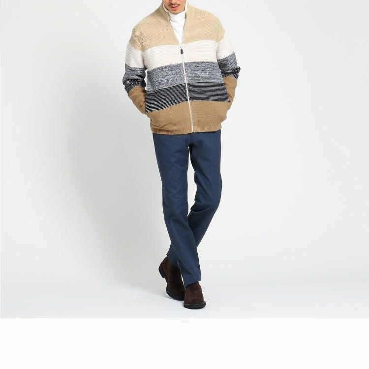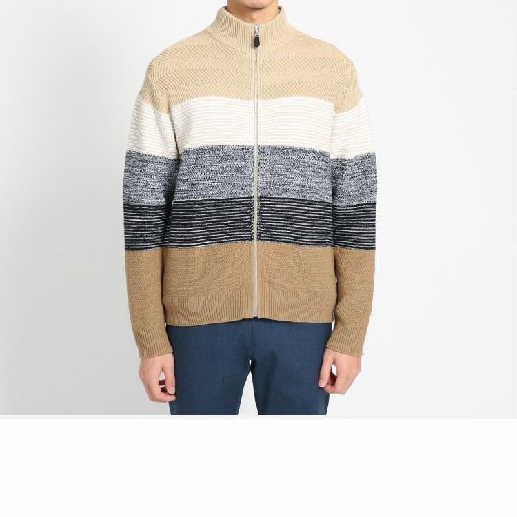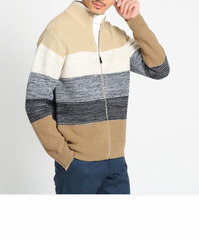 新品 TAKEO KIKUCHI タケオキクチ コットンアクリル メランジパネル ボーダー ジップアップ L ジャケット ニット ベージュ 上着 セーター