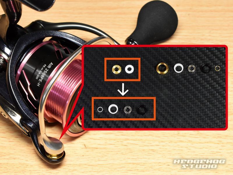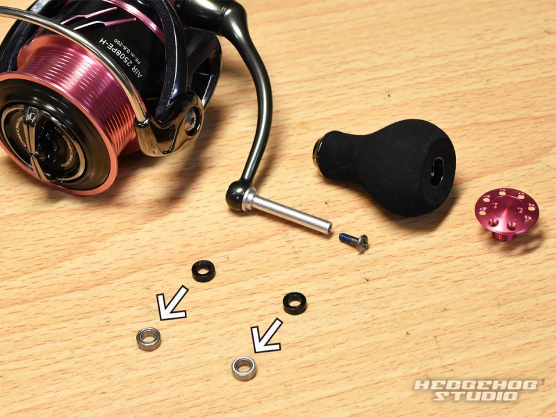■ラインローラー2BB仕様ベアリングチューン ![]() ラインローラー(ツイストバスターII)内部のプラスチックカラーをベアリング(740サイズ)に交換します。ドライバーでラインローラー部のネジを取り外し、内部のパーツをすべて取り出します。そして、オレンジ枠で囲っているパーツを付属のパーツと交換していきます。 ラインローラーの回転が良くなると糸ヨレが発生しにくくなりますので、 糸のしなやかさが保たれ、耐久性や飛距離も向上します。 ※注意 ![]() ラインローラーを固定しているネジは取り外す時に2.5mmの六角ドライバーが必要です。また、ネジはネジ止め剤によってきつくなっている場合もありますので作業時にはご注意ください。 ■ハンドルノブ2BB仕様ベアリングチューン ![]() ハンドルノブ部分も2個の黒いプラスチックカラーをベアリングに交換することで、2BB仕様にできます。 ハンドルノブの回転がよくなると、巻き心地が上がるだけでなく、感度や魚とのファイト時のやりとりなどもやりやすくなるメリットがあります。 ※こちらのキットを取付するにあたって、マグシールドが内蔵されているパーツ (マグシールドの刻印がされている、ローター下の部分)には一切手を触れません。 従いまして、作業中にマグシールドが抜けるようなことは一切ありませんのでご安心下さい。 ※パーツを組み直して純正の状態にリールを戻すことも簡単に可能です。 |