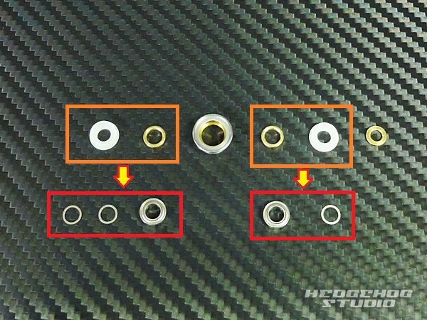 オレンジ枠で囲まれた白いプラスチックカラーを弊社商品のベアリング・調整ワッシャーと取り替えます。