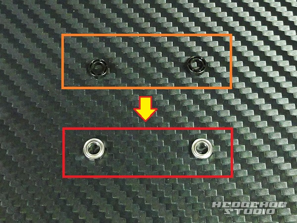 純正の状態では黒いプラスチックカラーが2個入っておりますので、これらを弊社のベアリングに取り替えます。