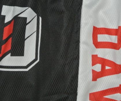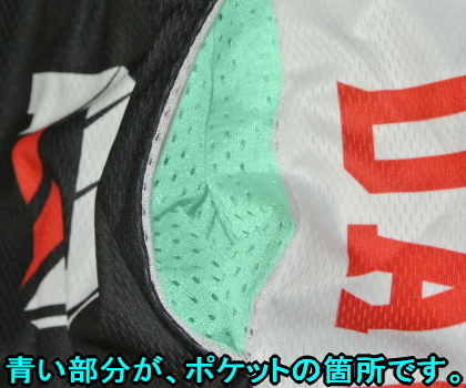 若干の光沢のある、サラサラした手触りの100% ポリエステル生地で出来ており、タテ長の細かなメッシュ穴が入れられています。ロゴマークや文字、ストライプなどは、全て生地への染付けです。