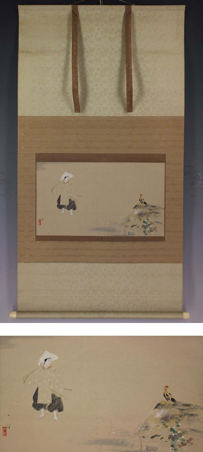 松本一洋 まつもと-いちよう (1893-1952) 大正-昭和時代の日本画家。 明治26年11月29日生まれ。山元春挙に師事,早苗会にはいる。歴史画を得意とした。昭和8年帝展審査員,11年母校京都市立絵画専門学校の教授。18年から耕人社を主宰(しゅさい)する。昭和27年3月9日死去。58歳。京都出身。本名は謹之助。作品に「蝉丸」「餞春」。 本紙は、シミ、汚れ、折れ、シワがあります。 表装は、シミ、汚れ、シワがあります。 【サイズ】 作品 横約50.5cm×縦約29cm 表装 横約65cm×縦約124cm |