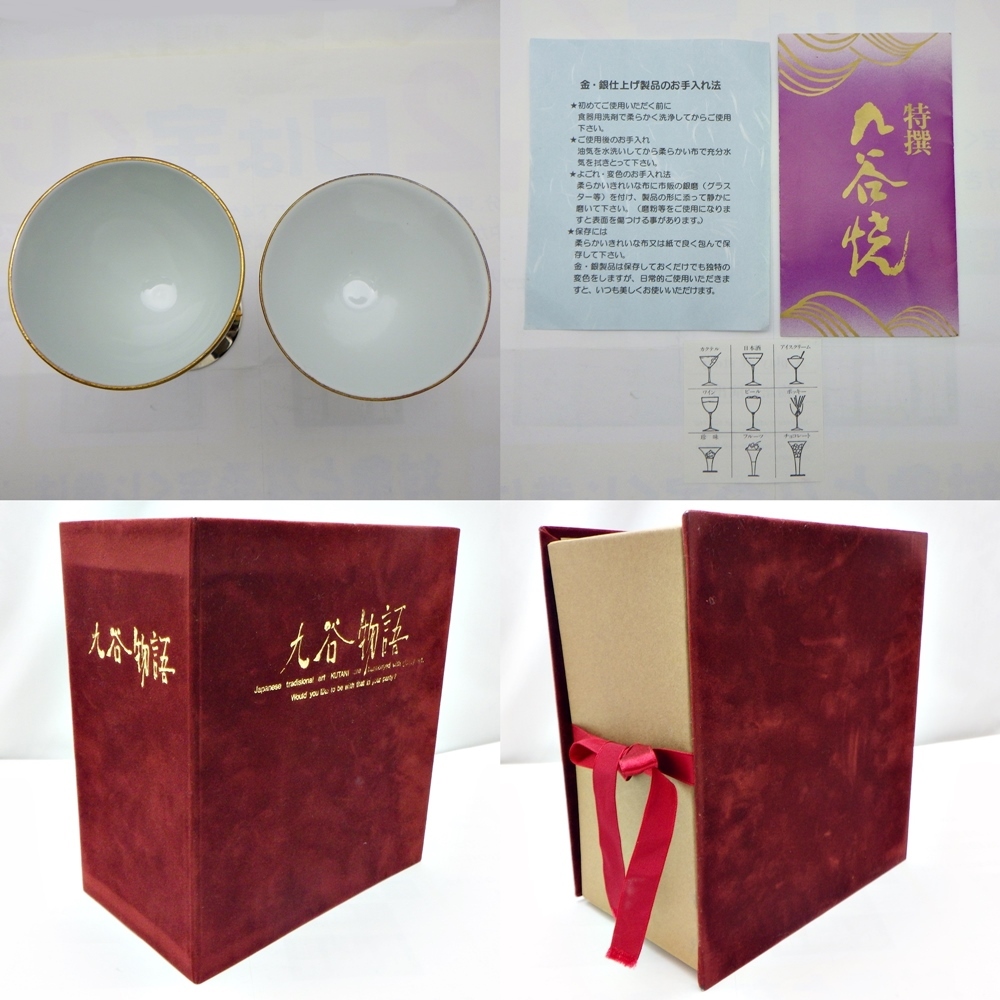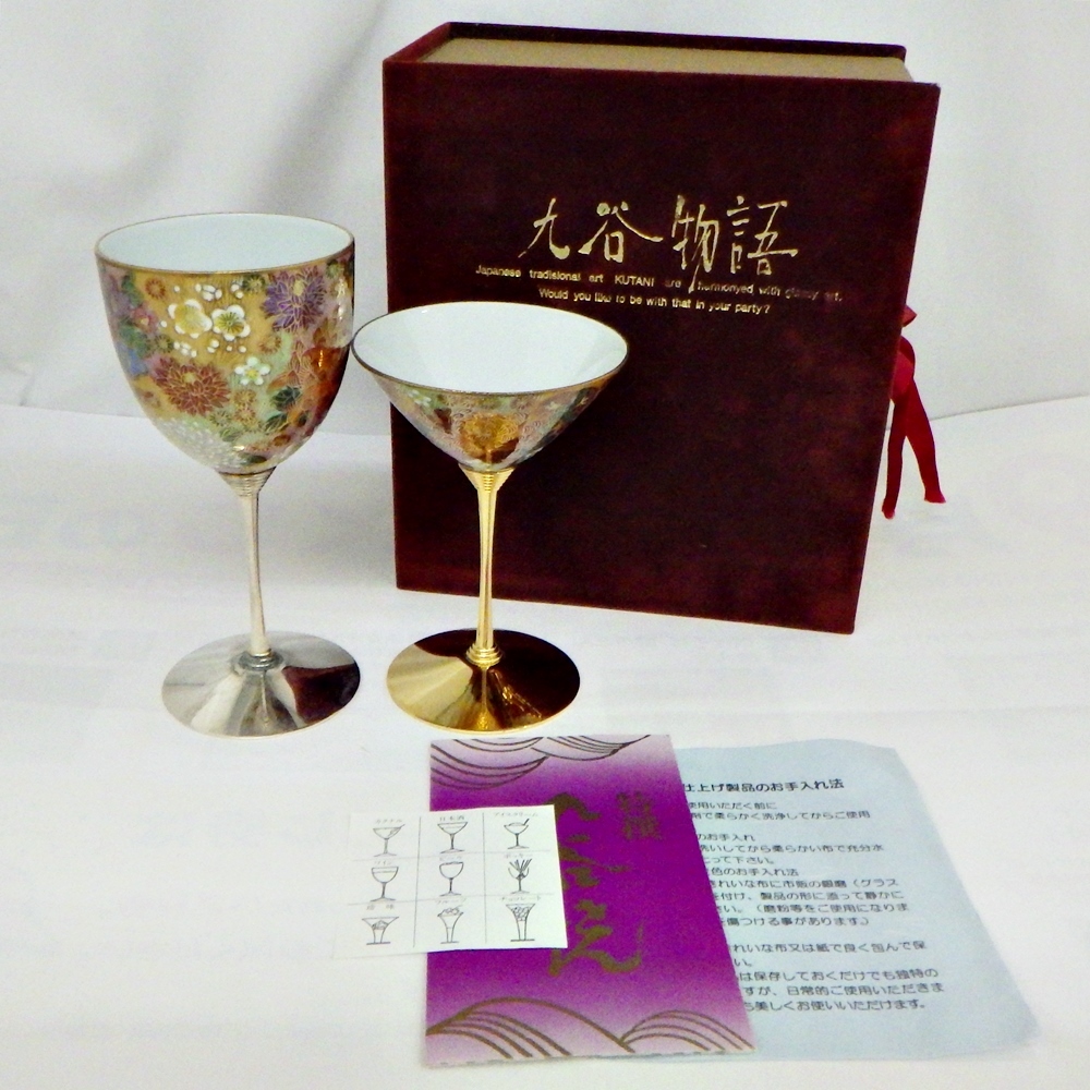 25-H-182 九谷焼 九谷物語 金花詰 ワイングラス カクテルグラス 2客セット KUTANI 金 銀 変色あり 箱付き 保管品