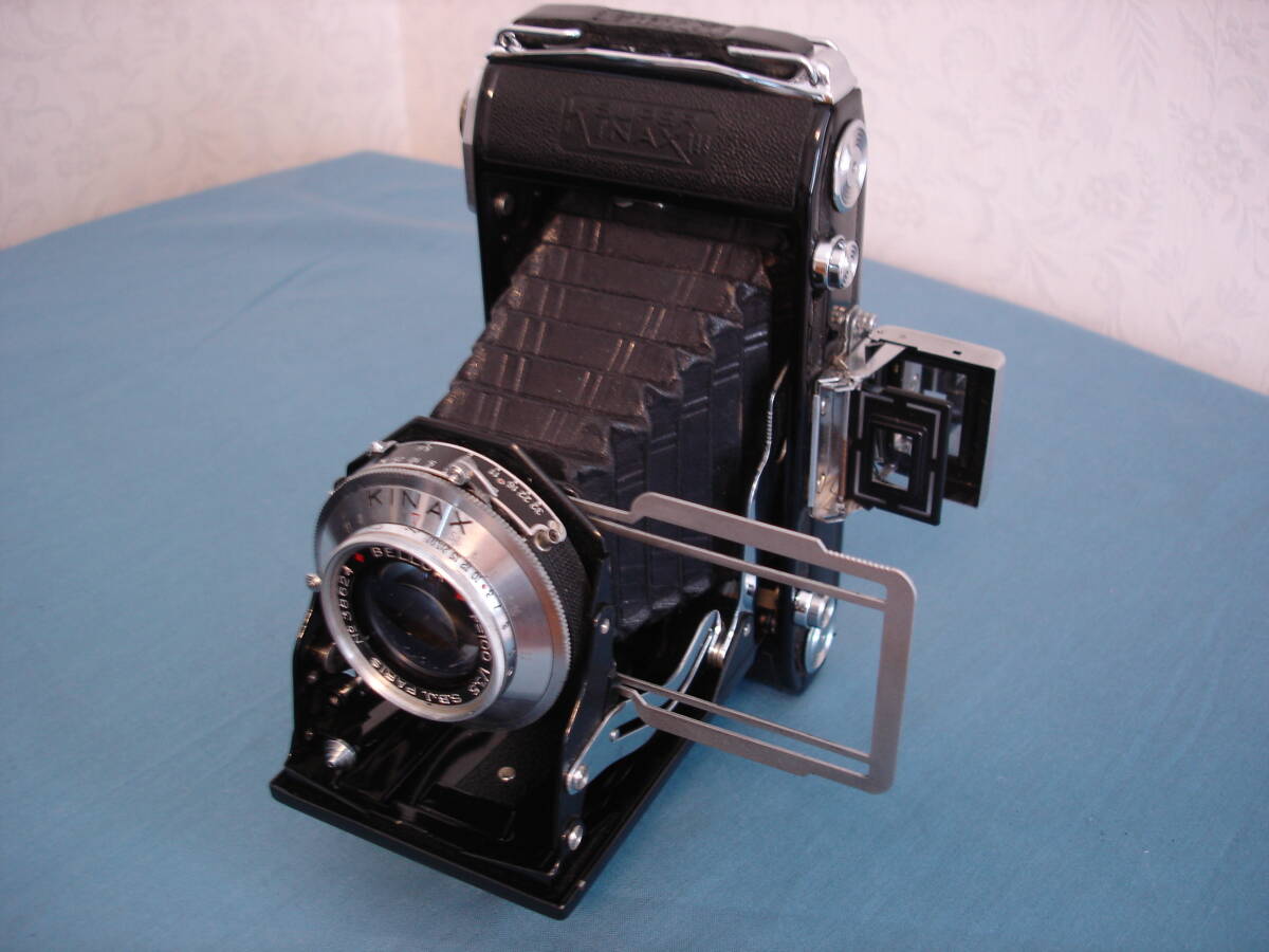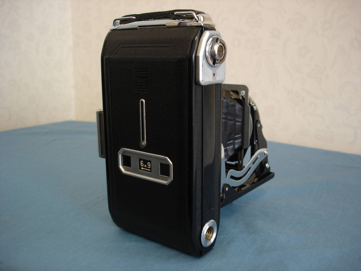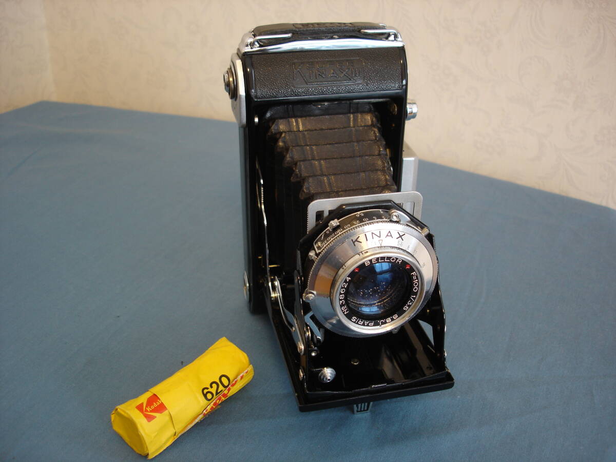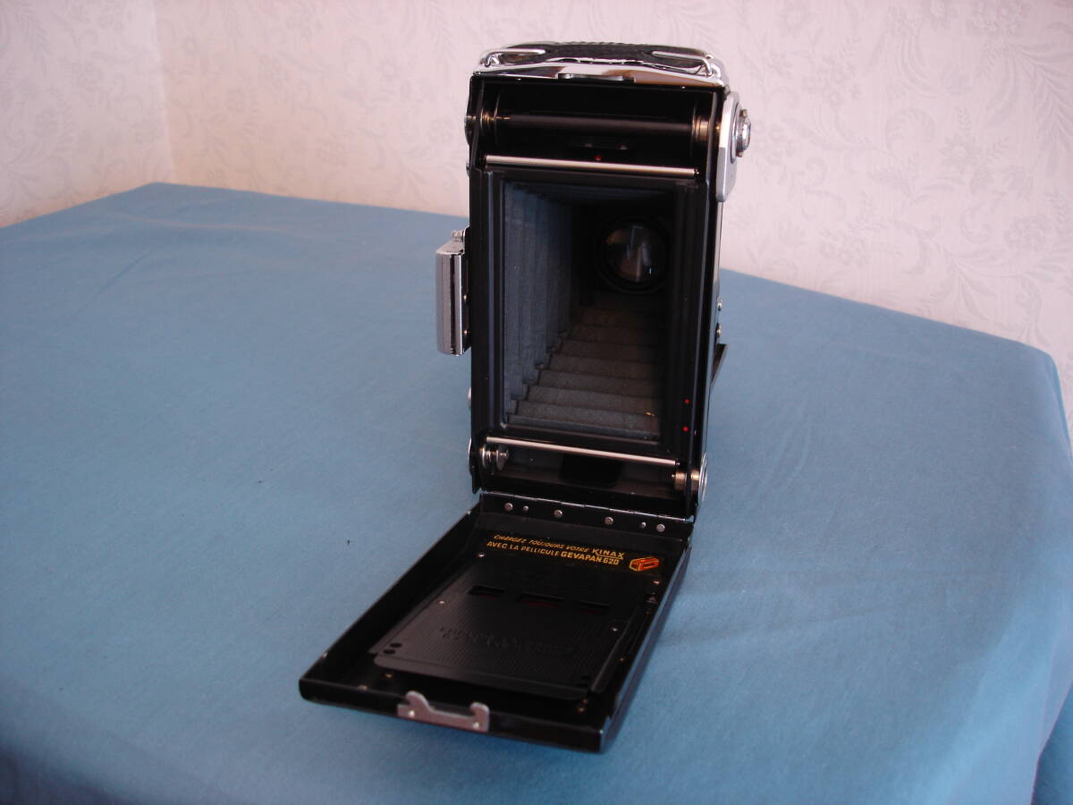 1950年台に作られたフランス製蛇腹カメラ。 620フィルム使いの6X9判カメラです。 620フィルムは120フィルムと同じ幅、長さのフィルムですが、軸の径等が異なるので、撮影に使うには120スプールに巻替える必要があります。