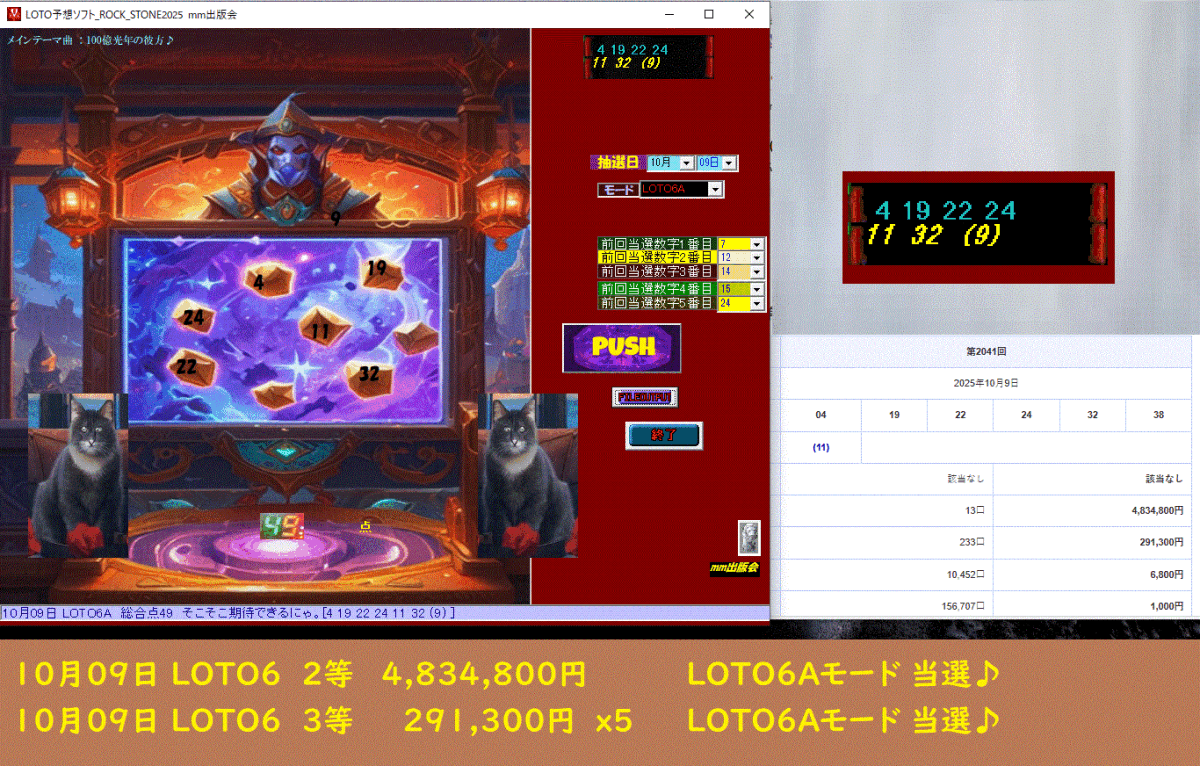 新作 [LOTO予想ソフト_ROCK_STONE2025] ロト予想ソフト 10月09日 LOTO6 2等  4,834,800円 LOTO6Aモード 当選♪